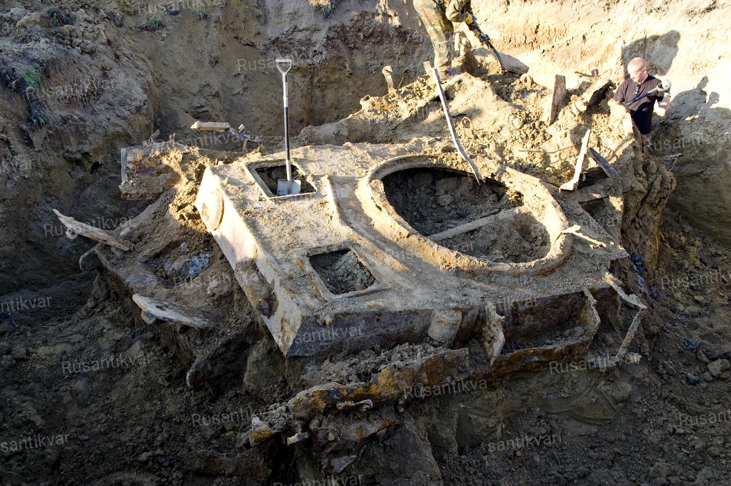 Когда появился экскаватор, работа стала набирать обороты и среди лежащих по-отдельности колес и фрагментов металла, начали появляться следующие детали: бронированный видоискатель водителя, обойма с рукояткой «MG»…Лицевая плита танка, по мере откапывания, стала постепенно приобретать свою форму.