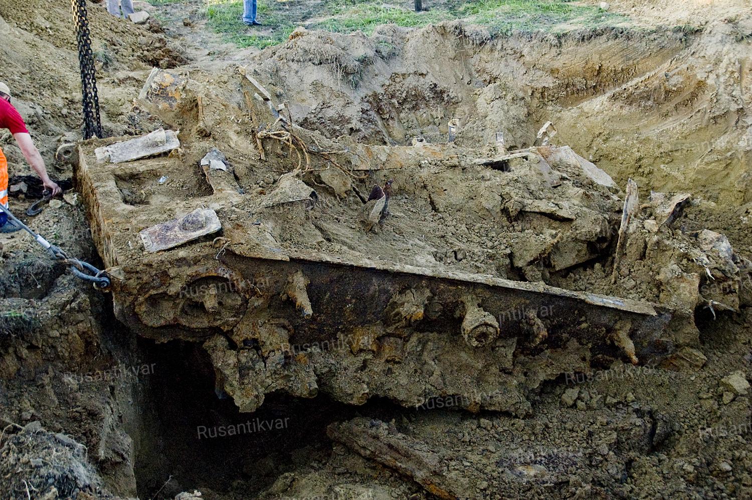 После 16.00 на место работы прибыли два крана. Время летело невероятно быстро, а из-под слоя земли местами появились части корпуса боевой машины. Роликовые тележки сохранились почти полностью. Также стали видны и повреждения корпуса после взрыва.