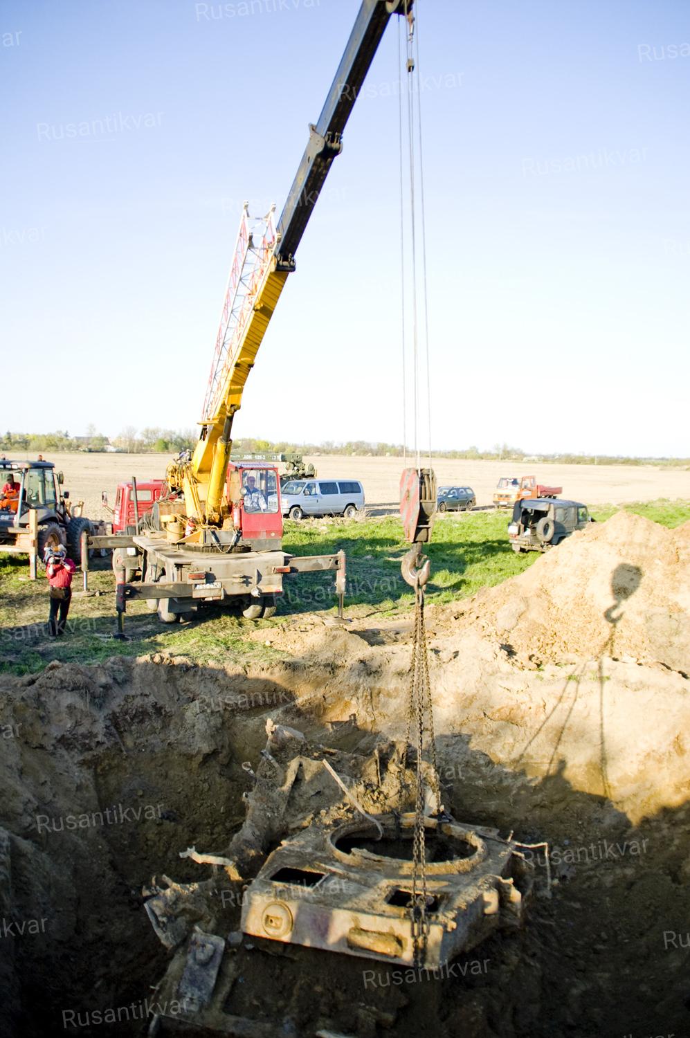 В 17.30 начал работу кран. После некоторых трудностей из ямы достали надстройку корпуса, оторванную от днища силой взрыва. К сожалению, наше счастье длилось недолго, поскольку вскоре выяснилось, что один кран не может даже пошевелить застрявшее днище. Нам снова пришлось взяться за лопаты, чтобы как-то помочь крану. Через тридцать минут нашего упорного труда, на этот раз уже два крана, не без проблем, смогли опереть «тело» танка на край котлована, а мы, уже с меньшим энтузиазмом, принялись выгребать из него землю.