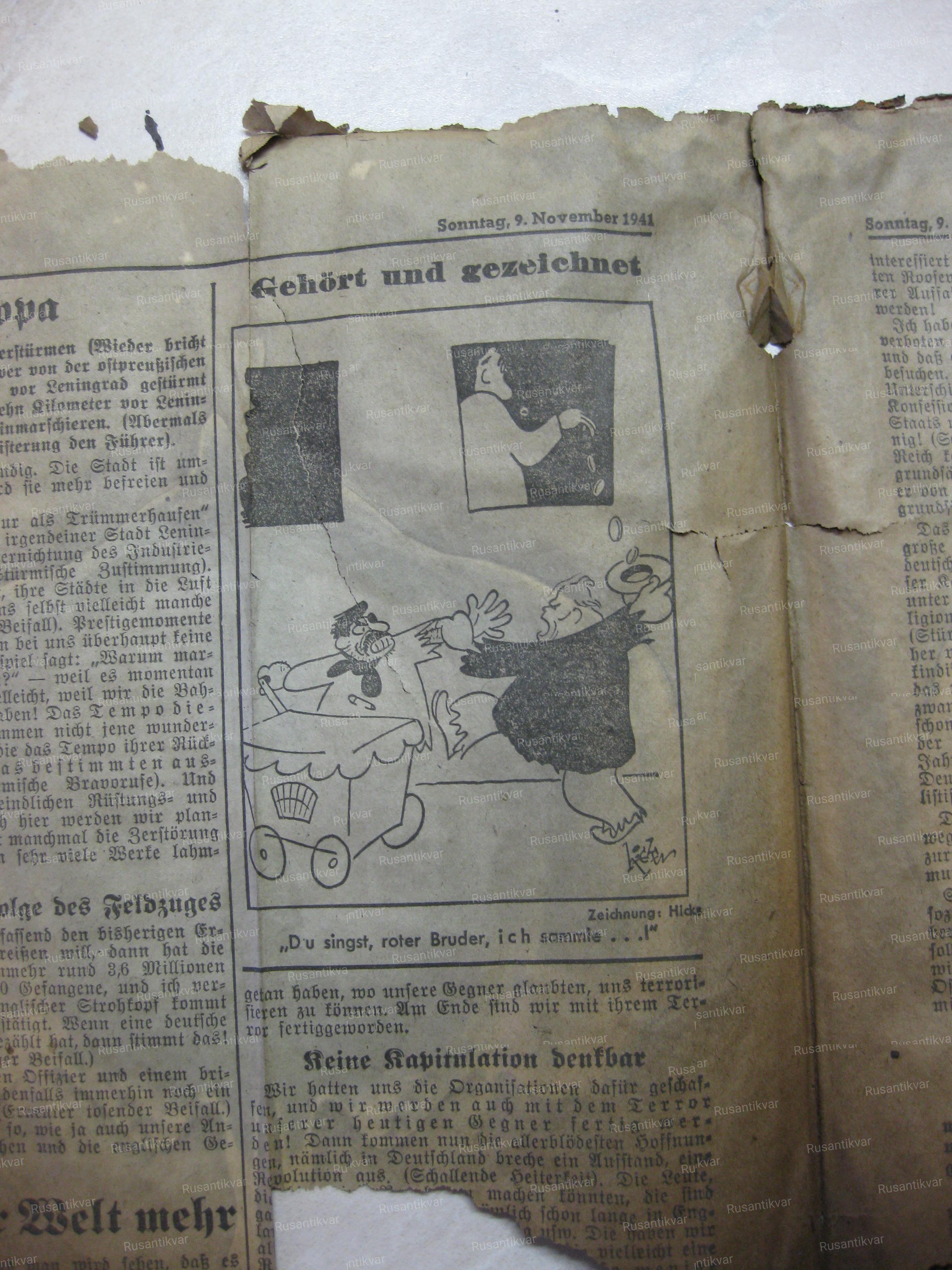 К сожалению, перевести на русский язык все газетные материалы мы не имеем возможности, но на примере этих ярких заголовков становится ясно, что немецкая пресса того времени не сильно отличалась от советской. Не стала исключением и публикация колких карикатур на И. Сталина и будущих заокеанских союзников и фотографий с фронта или тыла, поднимающих боевой дух солдат противника.