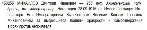 ГК 4 ст. 453255 МИХАЙЛОВ Дмитрии Иванович — 255 пех. Аккерманский полк 5 рота, мл. унтер-офицер. Награжден 28.09.1915 от Имени Государя Императора Его Императорским Высочеством Великим Князем Георгием Михайловичем за выдающиеся подвиги храбрости и самоотвержения в боях против неприятеля.