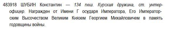 Георгиевским Крестом 4 ст с номером 483.918 награжден Шубин Константин - 134 пешая Курская дружина, старший унтер - офицер. Награжден от Имени Государя Императора, Его Императорским Высочеством - Великим Князем Георгием Михайловичем, в память годовщины войны.