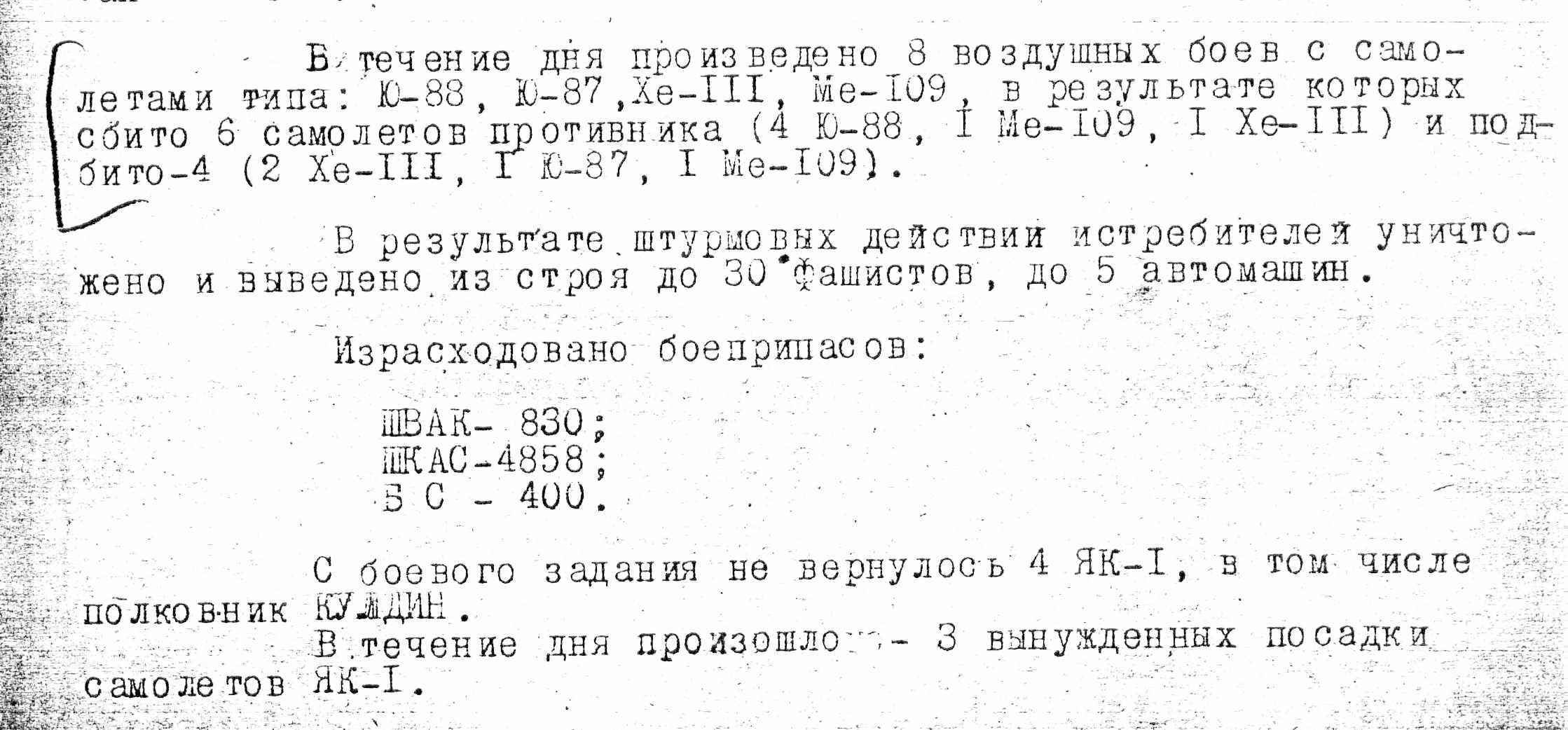 «… 5. 32 ИАП прикрывал наши войска и действия экипажей 204 БАД в р-нах указанных в п. 1-ом. Летало 17 ЯК-1. Произведено 26 самолётовылетов, из них: на прикрытие войск – 17, на прикрытие ПЕ-2 – 9. Налёт – 21ч.30мин.