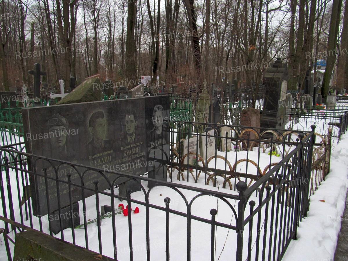 Морозным декабрьским днём мы разыскиваем могилу полковника Кулдина на Введенском кладбище. Семейная ограда Кулдиных, четыре большие плиты из чёрного диорита с портретами и именами. Справа – молодой парень в лётном шлеме, погибший в испанскую войну (брат). Рядом – строгий офицер с погонами полковника, убитый в Великую Отечественную (муж). Правее – молодой ученый, отдавший жизнь в «холодной» войне (сын). Справа – Вера Яковлевна Кулдина, которая всю жизнь хранила память о своих мужчинах, защищавших Родину и отдавших за неё самое дорогое – свою жизнь.