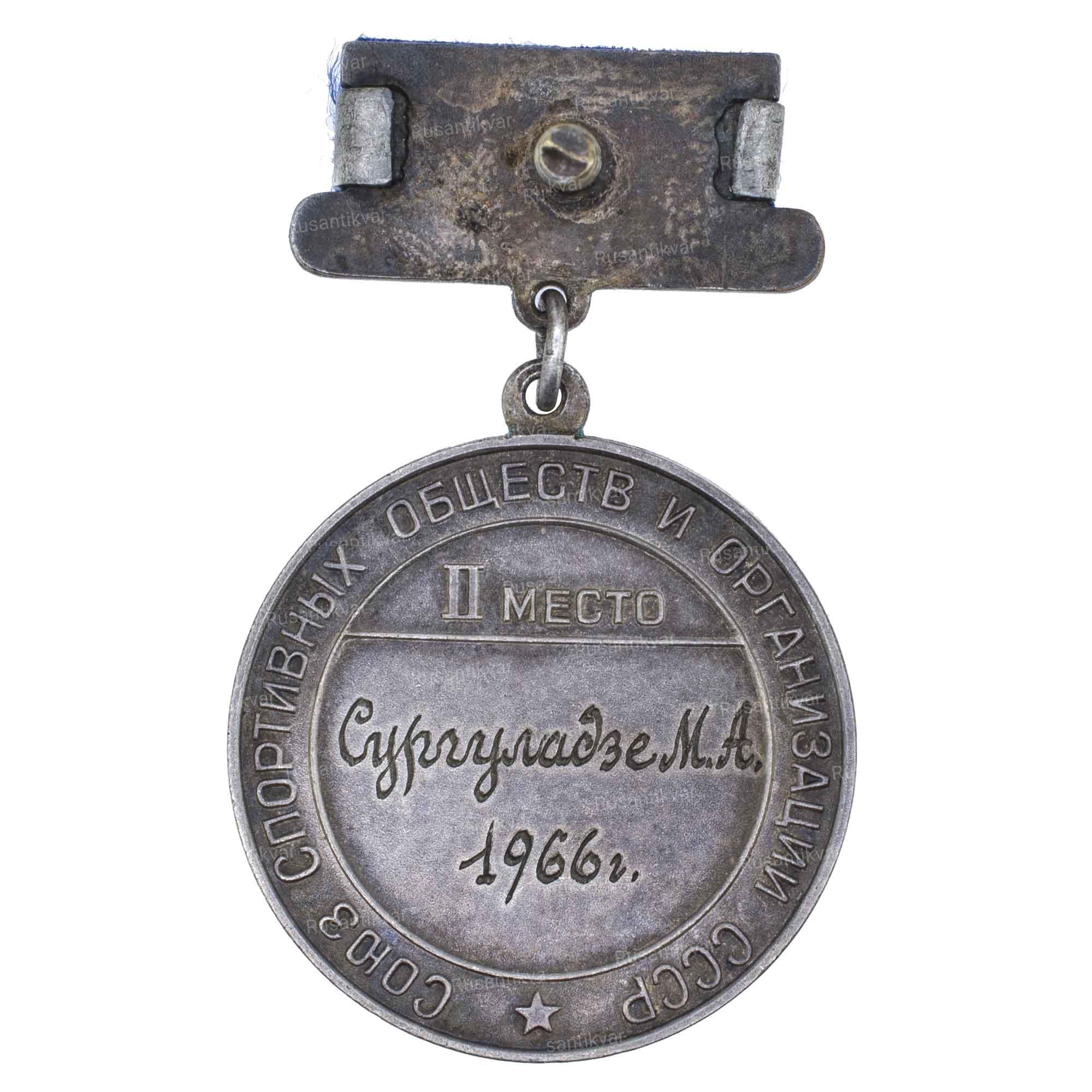ММД. Серебро, шелк (муар); 17,55 гр. Диаметр 28 мм. На гайке надпись по окружности: «МОНЕТНЫЙ / ДВОР». На об. ст. выгравировано: «Сургуладзе М.А. / 1966.».