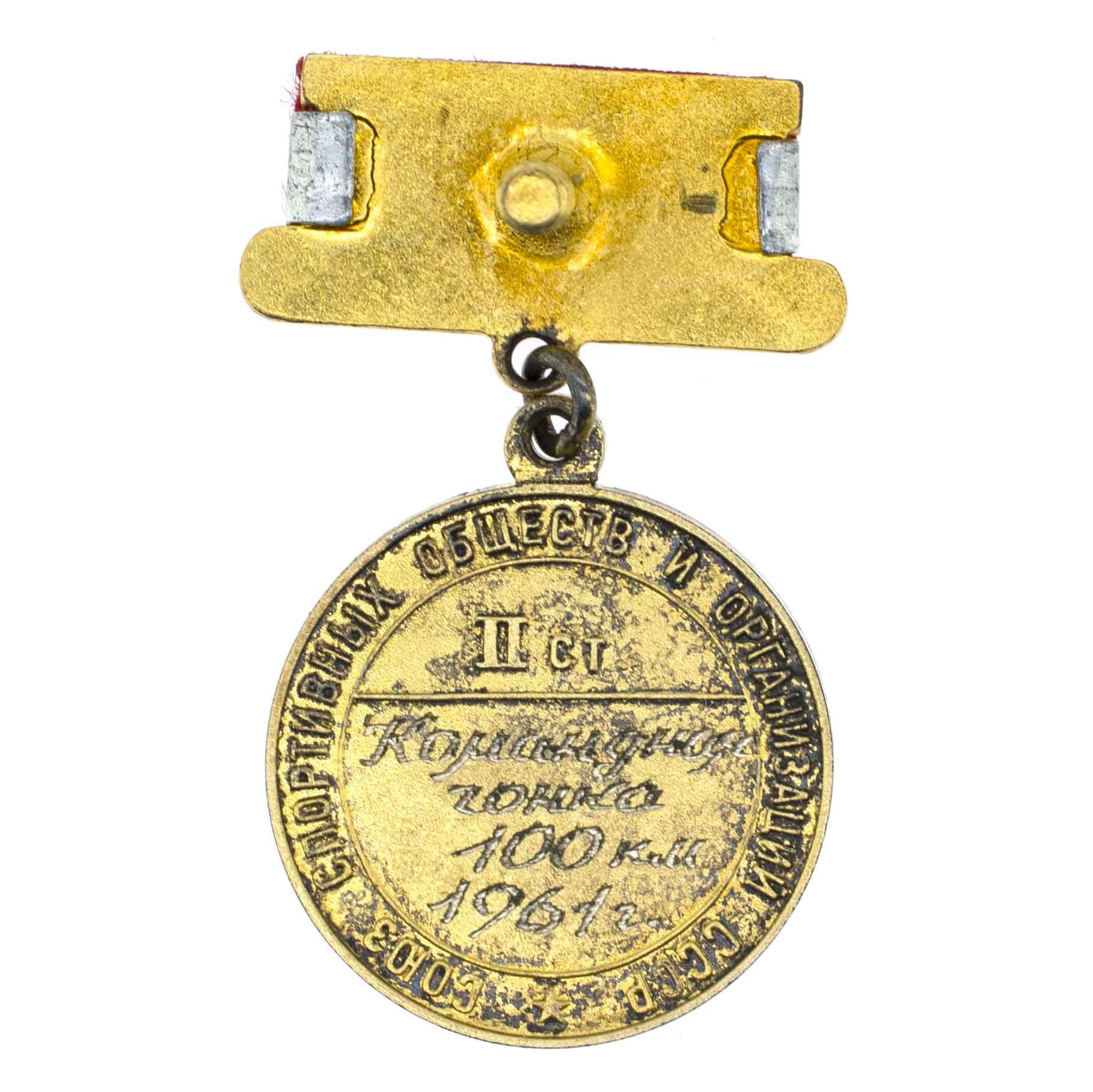 ММД, 1961 г. Серебро, позолота, шелк (муар); 12,04 г. Диаметр 18 мм. На гайке надпись по окружности: «МОНЕТНЫЙ / ДВОР». На об. ст. выгравировано: «Командная / гонка / 100 км/1961г.». Сохранность отличная. Редкая.