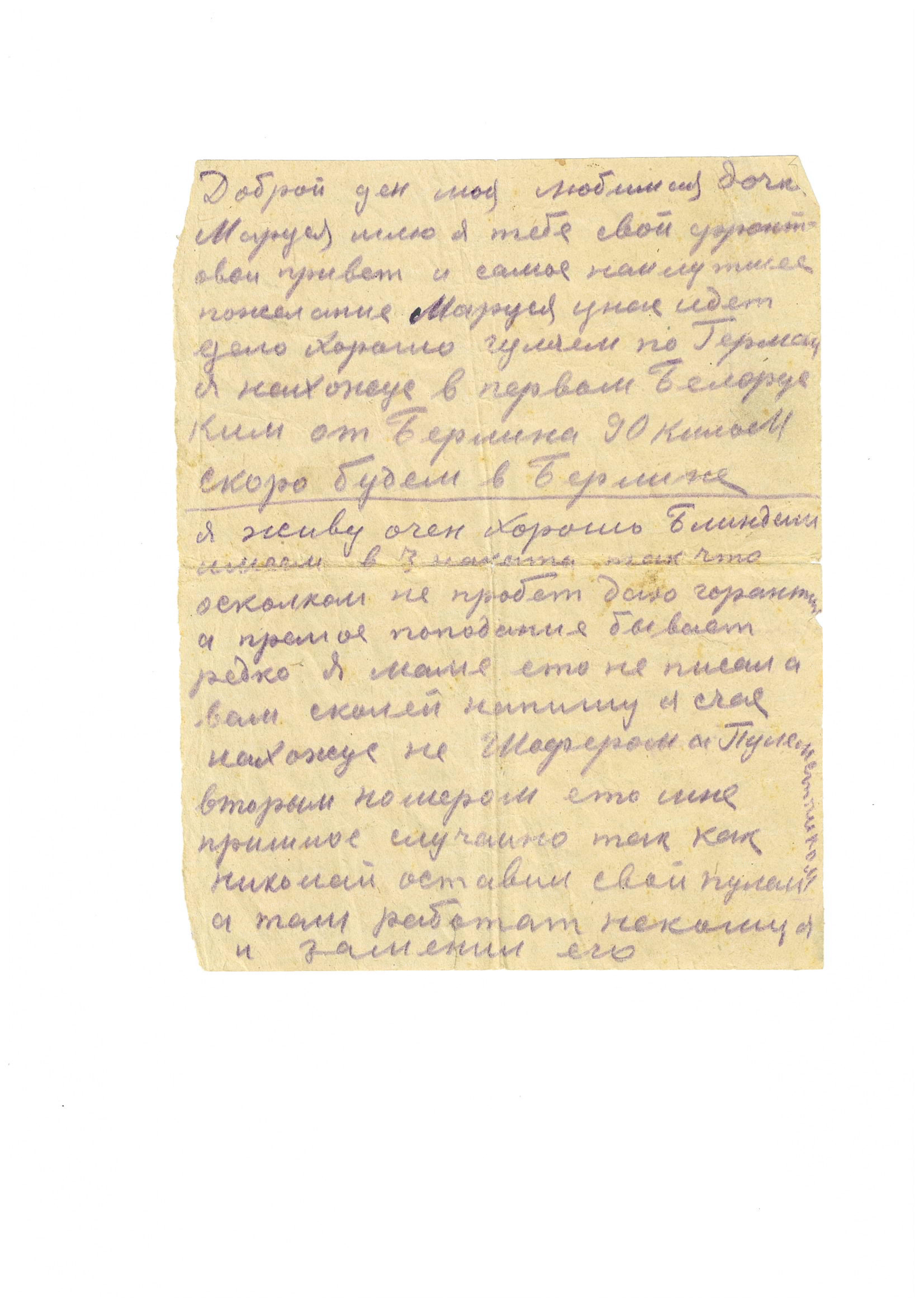 Маруся, у нас идёт дело хорошо, гуляем по Германии. Я нахожусь в первом Белорусском. От Берлина 90 километров, скоро будем в Берлине.