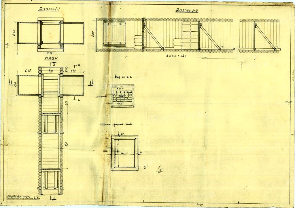 Общее представление о его конструкции может дать схема подкопа, проведенного на Ленинградском фронте в 1943 году в районе города Урицк (Рис 3). Единственным различием является то обстоятельство, что в 1943 году для крепежа использовали круглые бревна, а в 1942 году в Грузино в основном толстые необрезные доски. Основную часть досок заготавливали в ближайших лесах, а какая-то часть досок, вероятно, бралась с разбитых домов в окрестных деревнях, упрощая себе вопросы заготовки строительных материалов.
