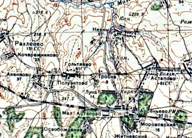 27. Так выглядят наши «рабочие» материалы совмещения современных спутниковых снимков и АФС 1943 г., с промерами до «ожидаемых» выходов траншей к железнодорожной выемке. Ст. Малоархангельск.
