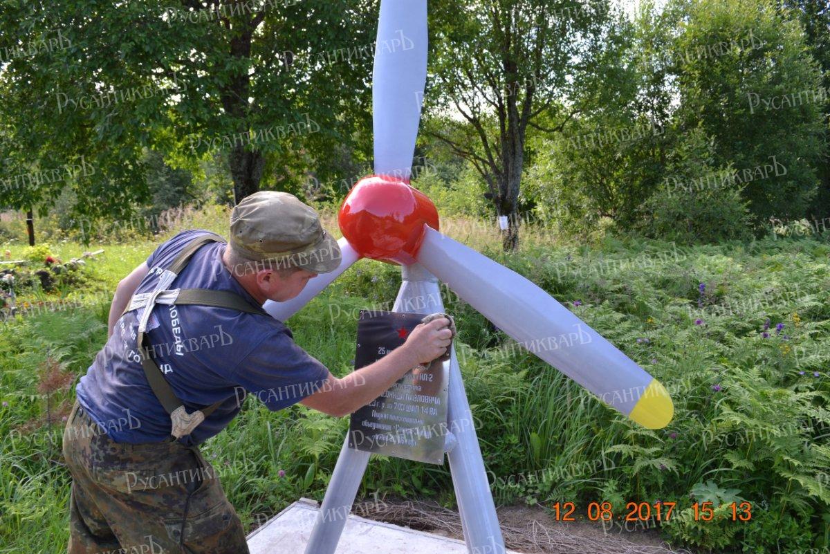 Пока шли поиски дочери, оставалось ещё одно дело, которое надо было обязательно сделать. Надо поставить памятную табличку лётчику на месте падения самолёта. Стали рассуждать, где именно её ставить. На месте падения никто, кроме охотников её не увидит. Сошлись на том, что надо ставить табличку у дороги, пусть и в некотором отдалении от места падения. Толя предложил установить не табличку, а целый памятник. Но какой он должен быть? Он стал самостоятельно прорабатывать концепцию. Он должен быть оригинальный, не похожий на другие. Исполнение должно быть обязательно антивандальное. Чтобы маргинальные личности не смогли его испортить. Но что изобразить на памятнике? В каком он должен быть виде? Толя придумал. Конечно, это должен быть винт самолёта. Но самолёт советский, поэтому соответственно у подножья памятника должна быть звезда. Причём, большая и, разумеется, красная. Из чего лопасти сделать? Из алюминия нельзя. Место не охраняется, могут отпилить. Трубы! Большие толстостенные стальные трубы! Если вырезать из их боков, по трафарету лопасти, то они будут изогнутые, как и положено. Увлёкшись идеей, Толя вначале сделал макет памятника из обычной проволоки. В голову пришла идея установить пропеллер на подшипнике, чтобы он крутился от ветра. Но, казалось бы, прекрасную идею пришлось отвергнуть. Прямо перед глазами так и вставала ужасающая картина – молодые оболтусы раскручивают лопасти, а один из них случайно подставляет руку, ногу или не дай бог голову. Даже думать о последствиях было страшно. Пришлось от красивой идеи отказаться. Всю зиму Толя в свободное время занимался творчеством. Искал материалы, пилил, сваривал и зачищал детали будущего памятника. Место для установки выбрали видное. У перекрёстка дорог, Барское озеро-Назия-Апраксин-Карбусель. В районе урочища Вороново. На красивом взгорке, где уже был народный памятник воинам 286-й стрелковой дивизии. На этой высотке в 1993 году проходили первые поисковые захоронения. Тогда тут стоял самодельный корявый крест из потемневших брёвен. Под ним несколько лет хоронили воинов, найденных в окрестностях на «Вахтах Памяти». Позже останки перенесли на мемориал в Новой Малуксе.