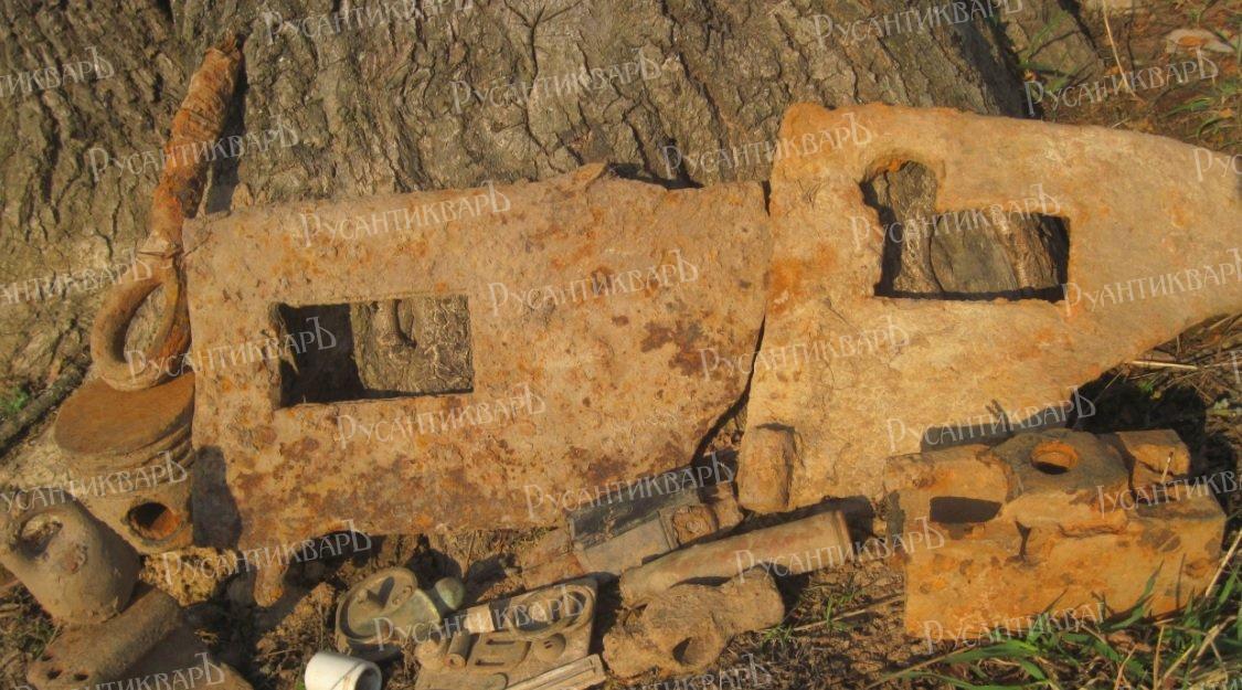 36. Слева на фотографии ступица колесного диска повозки зенитного орудия, справа верхняя часть амортизатора хода балансира опорного катка немецкого танка Pz-III. Фото автора.