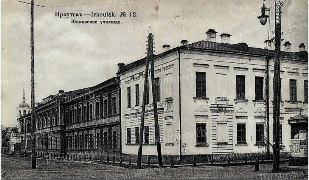 Первое время Иркутское юнкерское училище размещалось в деревянных зданиях, располагавшихся по улице Медведниковской (ныне ул. Халтурина). В 1879 все здания училища сгорели. После пожара училище разместилось в здании военной прогимназии. В 1882 училище было переведено в каменное здание бывшего военного госпиталя, находившегося на пересечении улиц Троицкой и Госпитальной (ныне улиц 5-й армии и Ярослава Гашека). 26 января 1912 военное ведомство выбрало земельный участок для строительства новых зданий военного училища, расположенный рядом с территорией будущего кадетского корпуса: между Загоскинской улицей (ныне ул. Ядринцева) на западе и Вагинской улицей на востоке, первой Иерусалимской (ныне ул. 1-я Советская) на севере и третей Иерусалимской (ныне ул. Трилиссера) на юге. Строительные работы начались в 1915.
