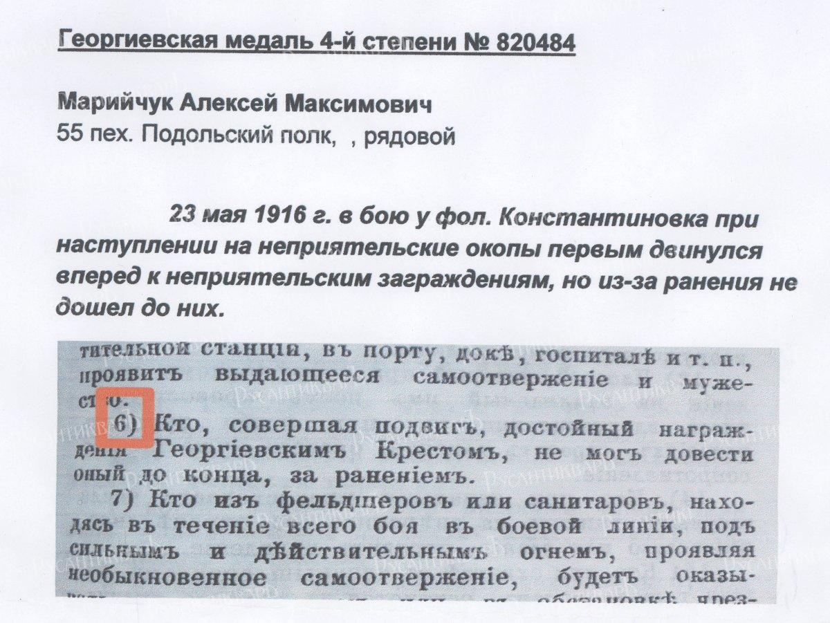 Награждён Марийчук Алексей Максимович 55 пех. Подольский полк, рядовой. 23 мая 1916 г. в бою у фол. Константиновка при наступлении на неприятельские окопы первым двинулся вперед к неприятельским заграждениям, но из-за ранения не дошел до них.