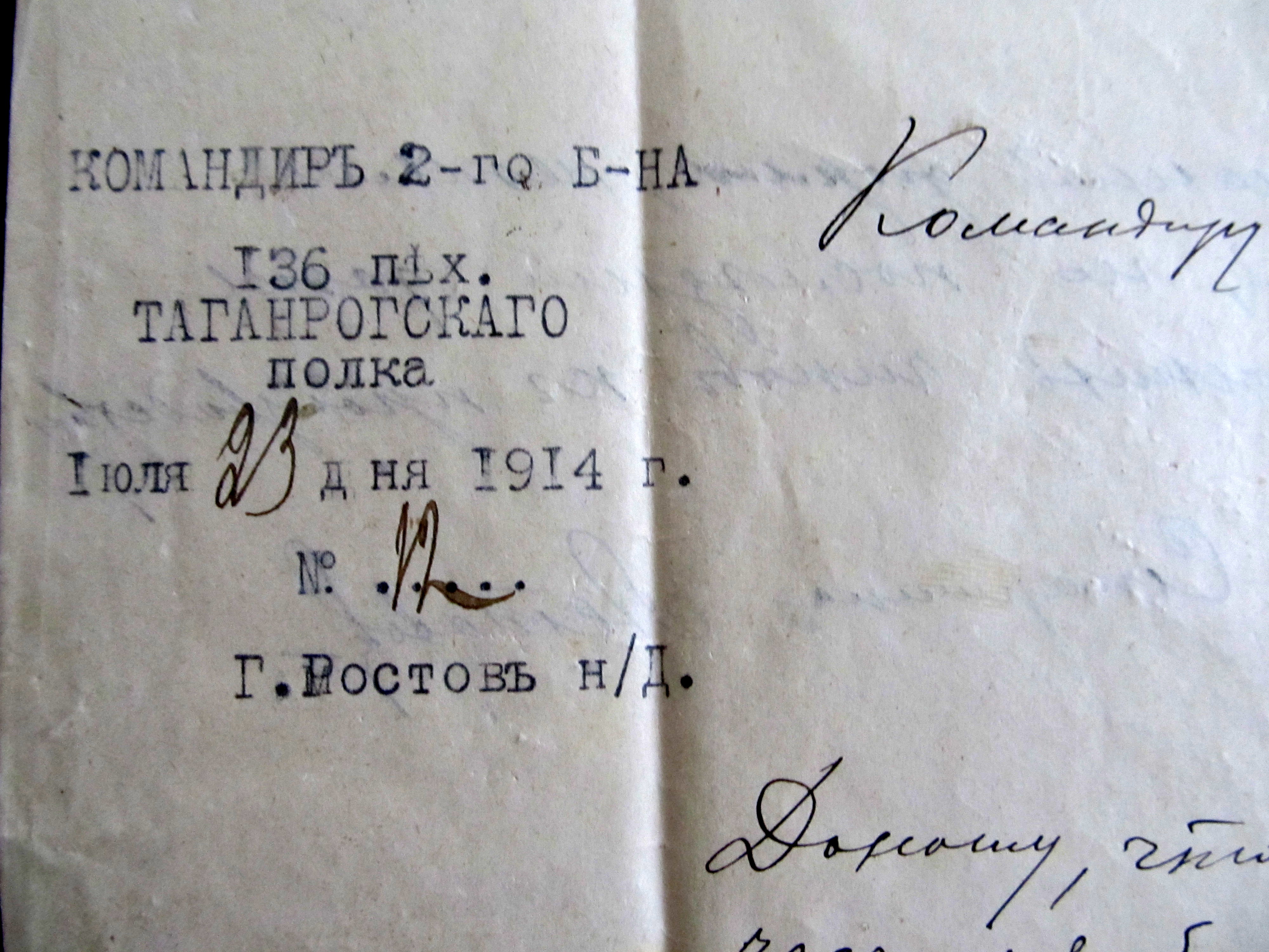 Дабы не ломать глаза, привожу текст рапорта в машинописном виде; Рапорт. Командиру полка. Доношу, что 22го июля 1914 года в час дня я заметил около 2го полицейского участка младшего унтер-офицера Таганрогского полка Якова Курганова и двух рядовых Стефана Ларина и Михаила Карпова. Все они были в крайне нетрезвом виде и нарушали общественную тишину. На моё распоряжение, обращённое к городовому, задержать названных солдат, Курганов стал грубо возражать, и вступил со мной в объяснение в дерзкой форме, жестикулируя и размахивая руками, солдаты, бывшие с ним также вступали в объяснение, но более в сдержанной форме, нежели унтер-офицер, но последний даже призывал нижних чинов к производству безпорядка. Войсковой Старшина Астафьев.