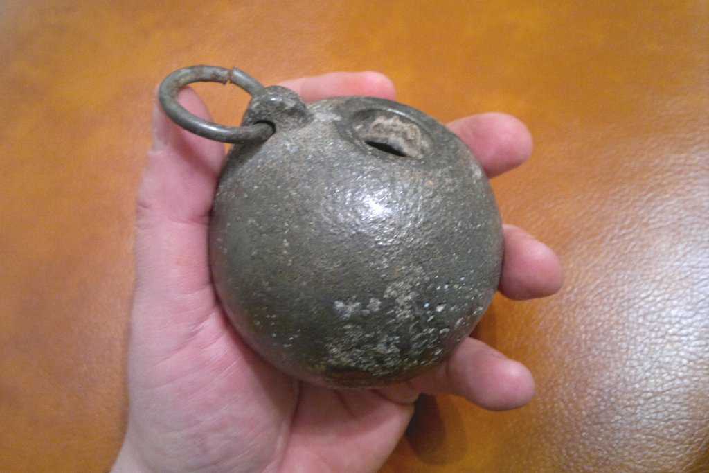 Граната Рдутловского обр.1912 года в исполнении 1916 года.К этому времени все воюющие стороны испытывали нехватку цветных металлов,поэтому в 1916 году этот тип гранат в основном делали из жести,что экономически было выгоднее.