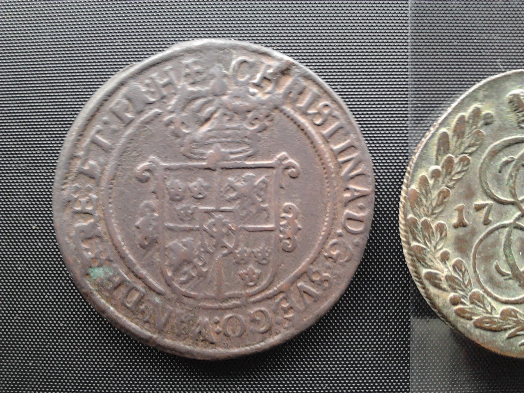 Шведские монеты этого периода (период окупации части Лен. области) очень популярны в Петербурге. В таком качестве на аукционе вполне способна уйти за 1500-1800 рублей, может, и выше. Номинал 1 эре, вес около 40 граммов, королева Кристина. В находках встречается нечасто. При мне только раз нашли подобную монету, самому не попадались.