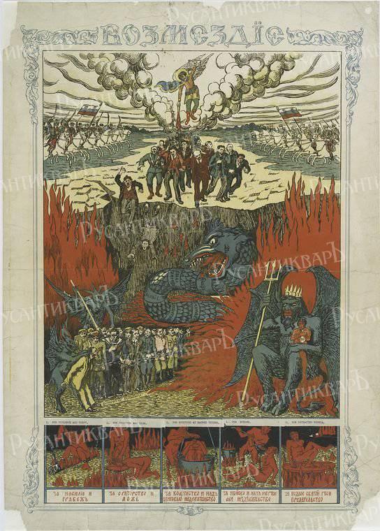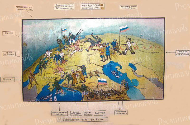 А вот белая пропаганда в основном сосредоточилась на создании образа врага, мало уделяя внимания тому, за что именно солдаты их армий проливаю кровь. Ленин и Троцкий на белогвардейских плакатах приобрели поистине инфернальные черты. Борьба большевиков с Церковью давала белым еще один козырь в идеологической борьбе, равно как и наличие в Красной Армии частей, состоявших из китайцев. А некоторые белогвардейские плакаты напоминают иллюстрации из печально знаменитой нацистской газеты «Штюрмер» - ведь евреем был не только Троцкий, но и многие другие лидеры большевиков. Фраза «Заграница нам поможет» появилась в знаменитом романе Ильфа и Петрова, но положительный образ «заграницы» не мог не появиться и на белогвардейских плакатах – Антанта за нас! А вот нужна ли Антанте единая и неделимая Россия? Такой логичный вопрос оставался «за кадром»