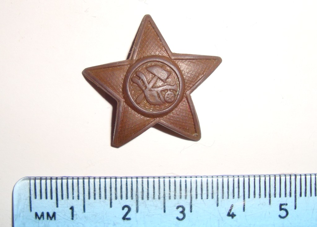 Практика сразу же показала, что знак на груди был недостаточно заметен из-за ремней амуниции. Поэтому летом 1918 г. был установлен значок-кокарда для ношения на головных уборах красноармейцев и командиров. Значок-кокарда из желтой меди являлся несколько выпуклой, покрытой красной лаковой краской пятиконечной звездой с выштампованными в центре нее скрещенными молотом и плугом; последние были желтыми, так же, как и окантовка самой звезды. Стандартный размер значка-кокарды – 36 мм, однако существовали звезды как большего, так и меньшего размера.