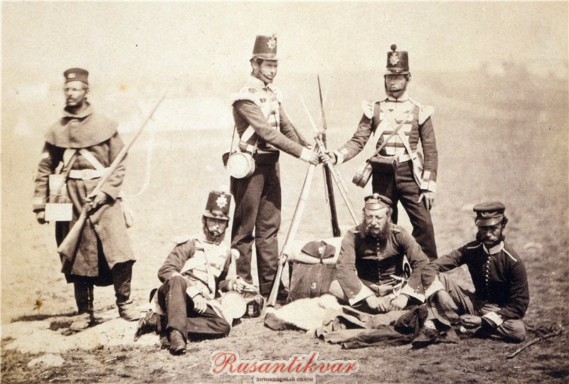 Группа военнослужащих 3-го пехотного полка. У стоящих и одного сидящего нижних чинов на киверах знаки образца 1855 года. Интересный набор знаков на фуражной шапке у сидящего офицера. У офицера легкой роты похоже, что знак в виде рожка с номером внутри.