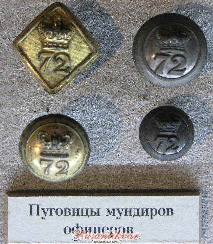Мундирные пуговицы офицеров, сержантов и нижних чинов 72-го пехотного полка из коллекции Музея Шереметьевых.