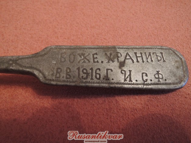 Вот еще образец алюминиевого литья. И годик, господа, отмечен рубежный — 1917, и пальчик указывает, чтоб не забылось. Едок до Крыма добежал. С обратной стороны надпись "НИ ПИРИЯДАЙ", и что характерно, стилистика букв как бы церковно-славянская, иконная (к сожалению, надпись притерта, и на фото видна нечетко). И предусмотрительно как! После 17-го русскому солдату точно уж переедать вряд ли часто доводилось.