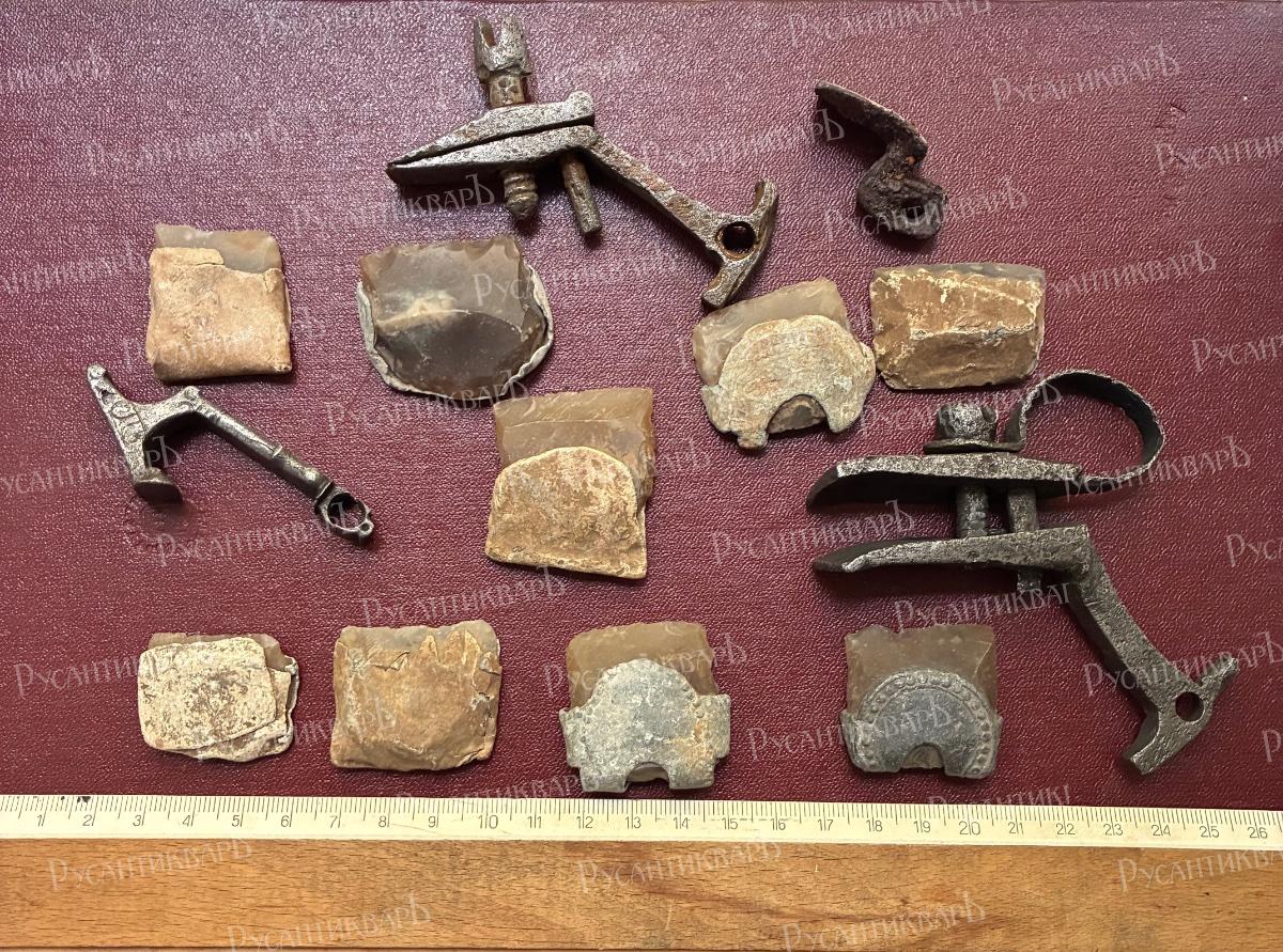 Детали ружейных кремневых замков и ружейные кремни в свинцовых оплетках.