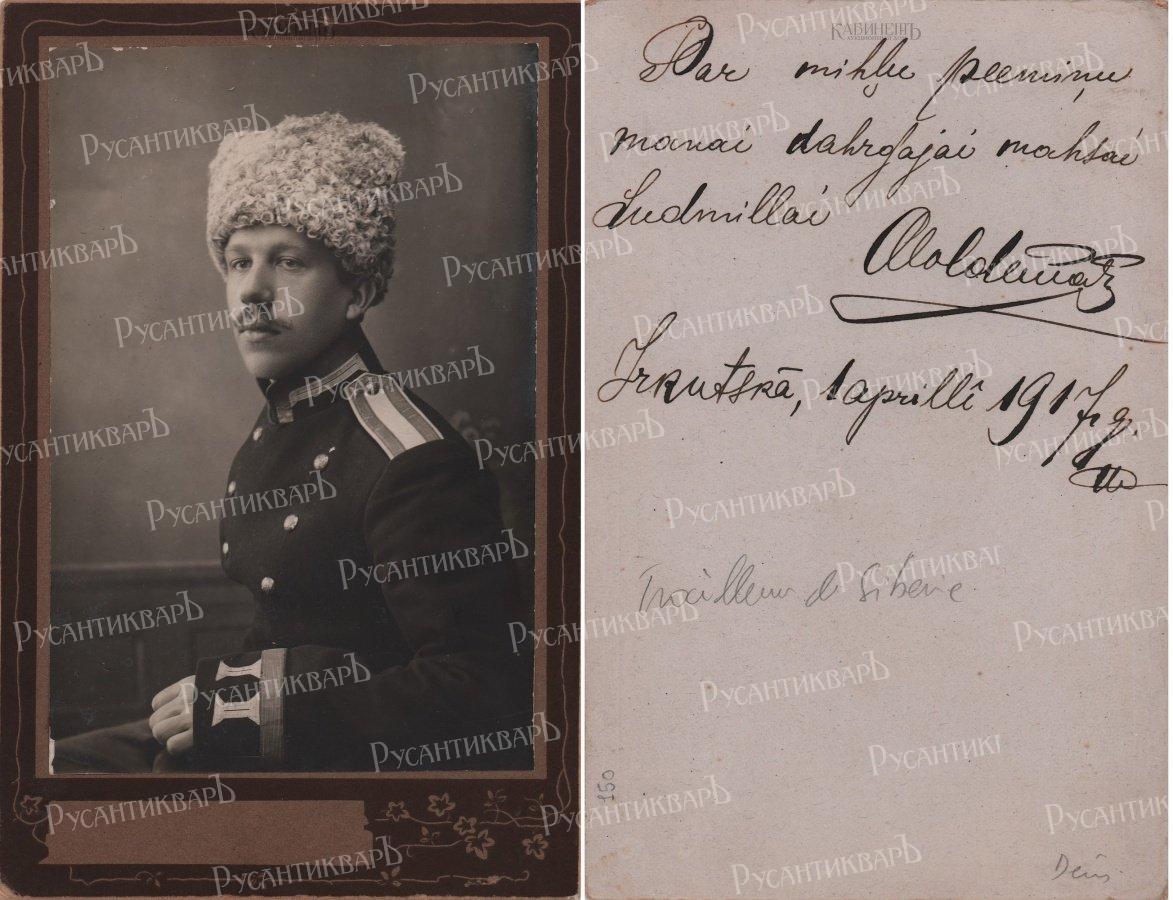 Тот самый юнкер,который в мае 1909 года при посещении училища главным начальником Военно-учебных заведений Великим Князем Константином Константиновичем,набрался храбрости предложил Великому Князю обменяться темляками. Родился 20 августа 1888 года в Усть-Каменогорске в семье канцелярского служащего. Окончил Усть-каменогорское городское трёхклассное училище. С 1906 по 1909 год обучался в Иркутском пехотном юнкерском училище. В 1913 году поступил на китайское отделение Института восточных языков во Владивостоке. В 1914 году был отправлен в командировку в Пекин для изучения языка. В июле 1914 года командировка была прервана мобилизацией. 11 сентября 1914 года выбыл на Западный фронт.