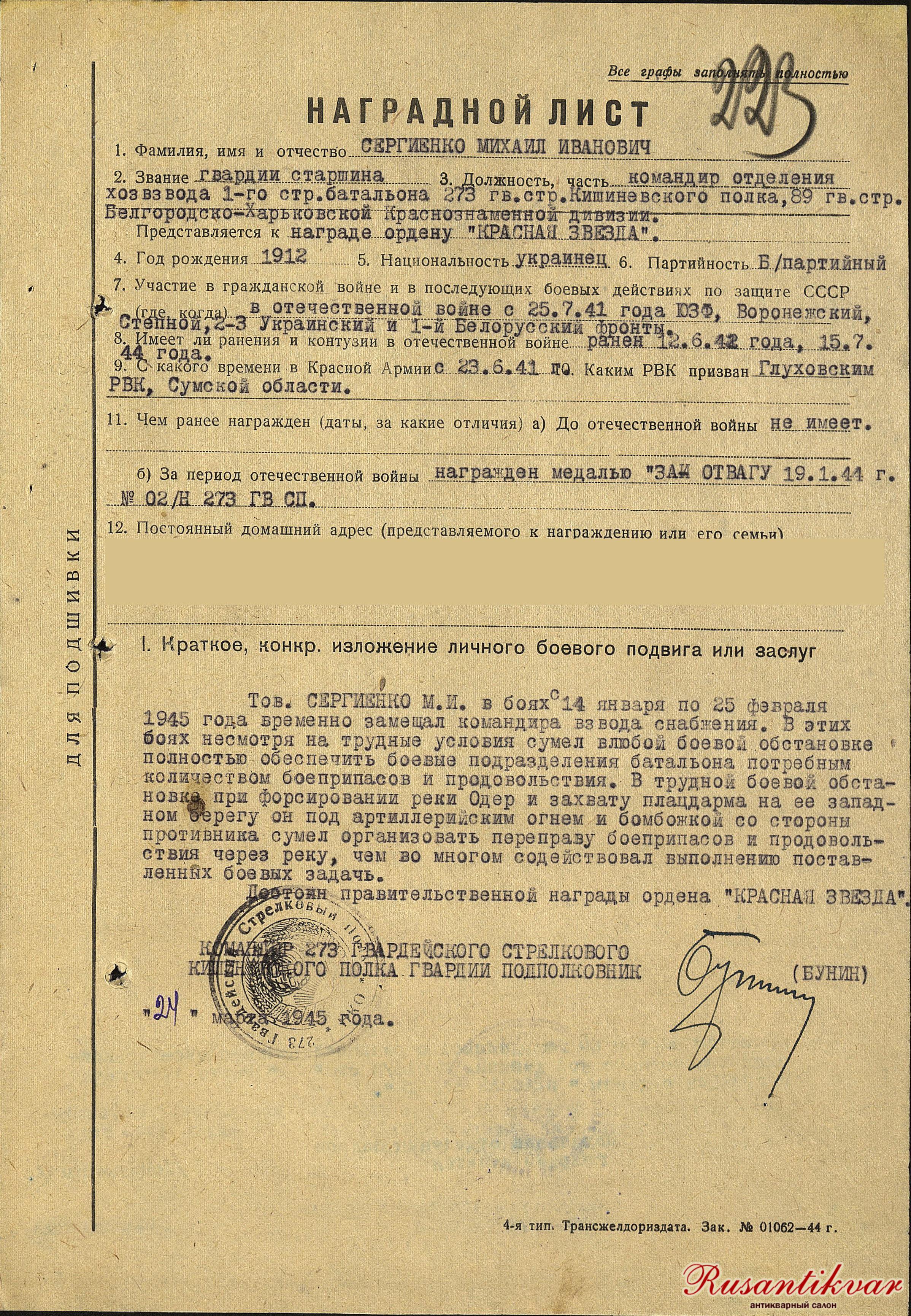 3.Наградной лист на орден Красной Звезды М. Сергиенко.