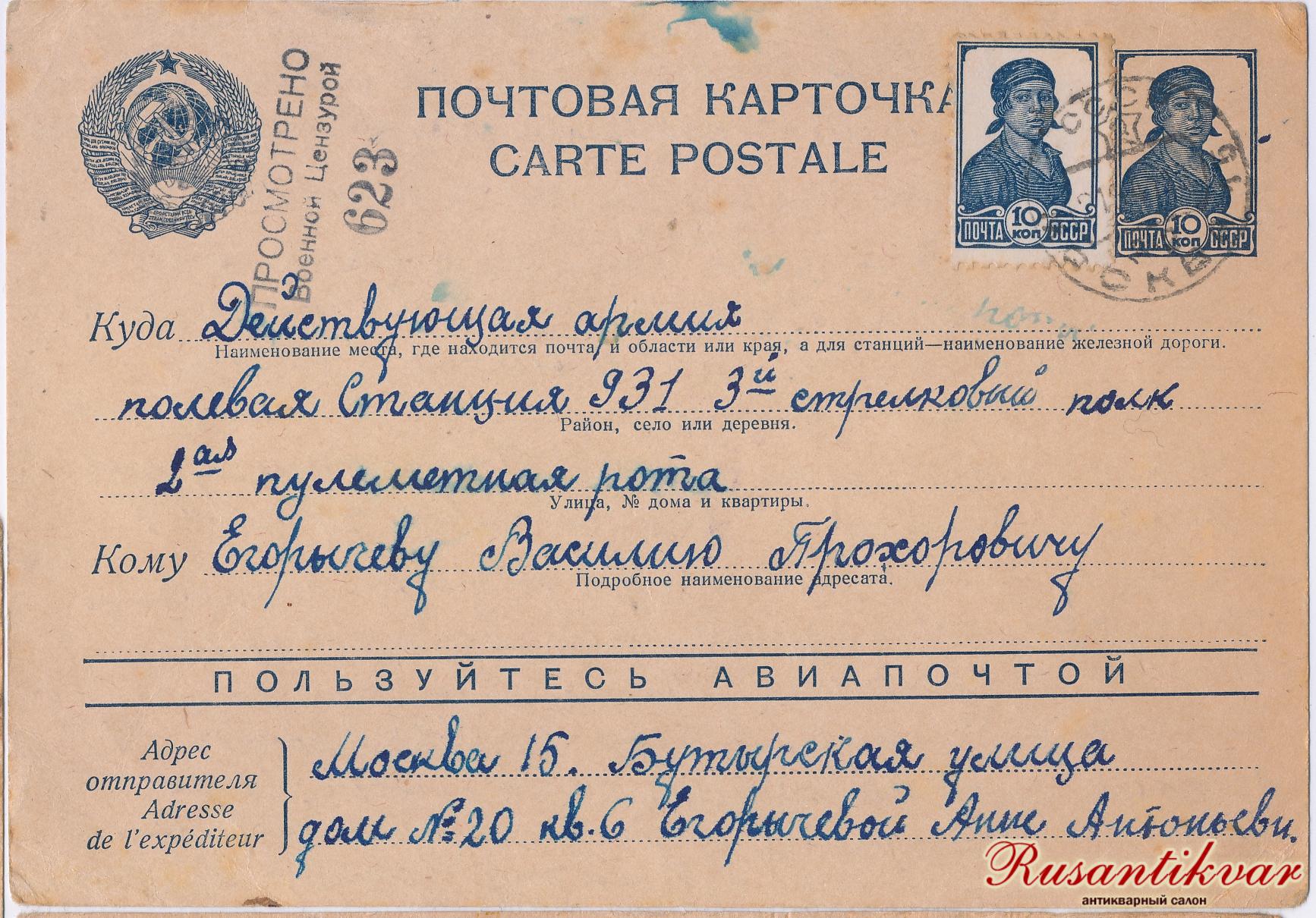 Одна почтовая карточка, отправленная в ППС 931 по ошибке, адрес на ней указан как ППС 527, п/я 47 (на самом деле верно п/я 17, это 17 дивизия Москворецкого района г. Москвы).