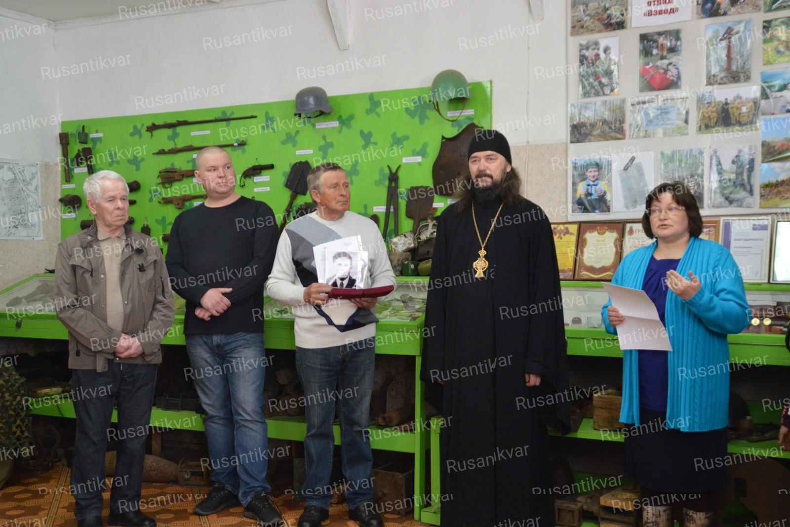 И вот настал самый трепетный момент: протоиерей Владимир Неганов ещё раз рассказал историю обретения медали и поиска родственников, а затем вручил награду сыну героя.