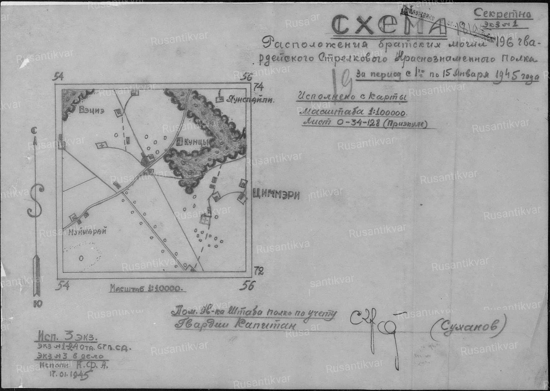 При этом были случаи, когда ошибки в документах ЦАМО (ОБД «Мемориал») вели к неверному определению места перезахоронения. Так, имена дюжины бойцов 196-го гвардейского стрелкового полка 67-й гвардейской стрелковой дивизии, погибших в январе 1945 года, оказались вместо Никраце бывшего Кулдигского района Латвии в 90 км севернее – в Попе бывшего Вентспилсского района Латвии. Когда мы впервые ознакомились со списком похороненных, составленном на основе данных Вентспилсского РВК, то долго не могли понять, в чем дело? Несуразная, казалось бы, дата гибели. Дело в том, что в январе 1945 года окрестности Вентспилса – глубокий немецкий тыл. Там похоронены партизаны, разведчики или погибшие в мае 1945 от рук нежелавших сдаваться даже после 9 мая немцев, подорвавшиеся на минах или погибшие в ДТП. Как там могли оказаться стрелки-гвардейцы?! Морской десант? Далековато от берега. Воздушный? А почему не десантников туда забросили? Тем более что в Попе действительно перезахоронены некоторые наши разведдиверсанты, погибшие в Курляндском котле. Погибли в плену? Нет, имена пленных редко когда на советских мемориалах можно встретить. Да и написано четко – «погибли в бою». Ответ же нашелся в ОБД «Мемориал». Оказалось, что писарь этого полка... ошибся. Вместо «Либавского уезда», «Приэкулесской волости» (не совсем то, но гораздо «теплее», чем Попе) или окрестностей «Никраце» (как писари других полков) он почему-то определил хутор Циммери, где первоначально были похоронены гвардейцы, в Виндавский уезд! Хотя даже на приложенной схеме было видно, что имелась в виду территория недалеко от Приекуле и Никраце. Излишне говорить, что остальные бойцы дивизии как раз в основном на мемориале у хутора Лиекни под Никраце и значатся. Но что произошло дальше? А после войны, в ходе обмена данными между РВК призыва и РВК, где располагалось место гибели, военком в Вентспилсе получает сведения о том, что в Виндавском (Вентспилсском) районе похоронены такие-то бойцы. А в Вентспилсском районе всего два братских кладбища, где похоронены солдаты Красной Армии. Но в Вентспилсе почти все известны. А в Попе достаточно безымянных. Похоже, почесал военком затылок и решил, следуя несложной логике исключения одного варианта из двух, что, получается, там они и похоронены – в Попе.