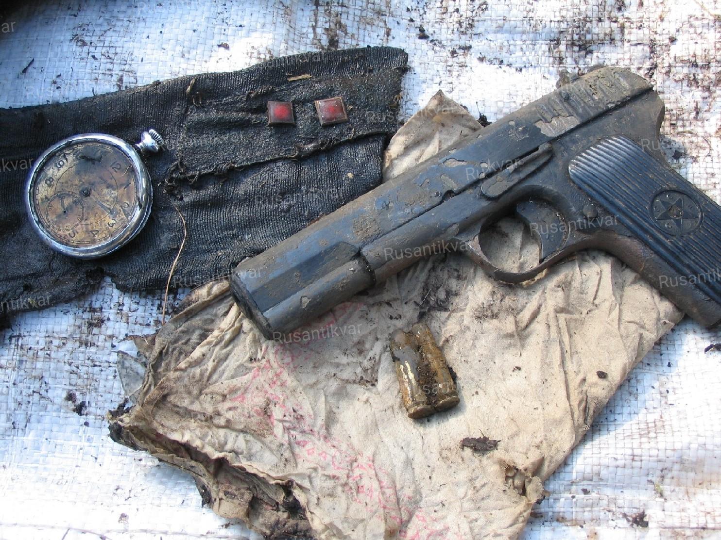 Как водится, на месте катастрофы кто-то уже основательно покопался. В отвалах воронки мы обнаружили многочисленные предметы экипировки: обрывки кожаных регланов, летных шлемов, обуви. Нашлись и костные останки членов экипажа, и часть их личных вещей: монеты различного достоинства, кусочки деревянной и штурманской линеек, фрагмент планшетки с обгоревшими бумагами, карманную расческу, подписанную «Оглуздин». При подъеме обломков бомбардировщика обнаружились и останки одного из летчиков. А вместе с ними документы, которые мы сразу же, с большой осторожностью запаковали в полиэтиленовый пакет для дальнейшей экспертизы. Также из воронки были извлечены сильно обгоревший и сгнивший парашют, ластик, носовой платок, часы, стрелки которых остановились в 2:30, ворот гимнастерки со знаками различия старшего лейтенанта ВВС, пистолет ТТ с номером ИВ 399 с кобурой и офицерским ремнем. На одном из обрывков найденного реглана сохранился воротник с отпечатавшимися знаками различия младшего лейтенанта или младшего сержанта.