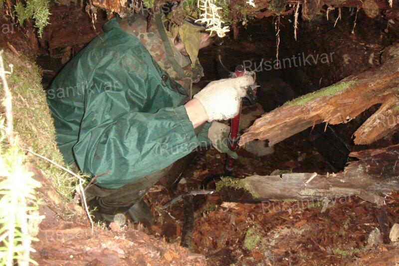 На следующий день мужики рванули на другую сторону озера, а мы побродили по нашему берегу, по окрестностям. Окрестности – это финские тылы, заваленные консервами и всякой тыловой ерундой. Ну, кому – мусор, а я мимо финской авторемонтной мастерской пройти не мог, и россыпи штучек на всякие «Опели – Хорьхи» меня возбуждают. Однако, в связи с доступностью всё уже копано-перекопано. Это «копано», конечно, очень условно – попадаются и некопаные помойки, и невскрытые полуобваленные блиндажи. Один из них заманчиво попискивал в дыре между рухнувшими и расползшимися балками перекрытия. Повозился с балками, грунтом и вездесущими булыжниками, под лопатой мелькнула кожа подсумка. Пока фантазия рисовала картину полной сбруи с прягой и штыком, руки лихорадочно работали лопатой. Увы – только финский подсумок с патронами. Состояние было плачевным: в руках рассыпалось всё – и подсумок, и содержимое. Но факт – «блин» не копан. Под подсумком обнаружилась некая конструкция из плотно пригнанных не сгнивших досок. Стол? Ящик? Идея того, что это может быть полом даже не пришла – ну какой пол в метре от среза земли и в полутора от бруствера? Но следующие полчаса раскопок показали – и правда пол. Здесь вам не Смоленщина, финский фортификационный гений обладал какими-то тайными знаниями, и блиндажи строили так – метр в землю, бруствер по кругу, на бруствере возводится из брёвен венцов 4-5, потом перекрытие, всё это засыпается грунтом и камнями. Ну и хрен с ним, зато копать проще – никаких тебе двухдневных маханий вёдрами и жидкой глины. Этот, и пара соседних блиндажей принесли только раскрытые в плоскость цинки и печные трубы. Найденная рядом некопаная помойка, несмотря на заманчивость, принесла только четыре водочных бутылки с надписью «Хельсинки» на пробке. Не, финны всё-таки полные босяки. Где надписи на стекле и выпендрёж в виде разноцветных бутылочек хитрой формы? Никакой культуры производства стеклотары!