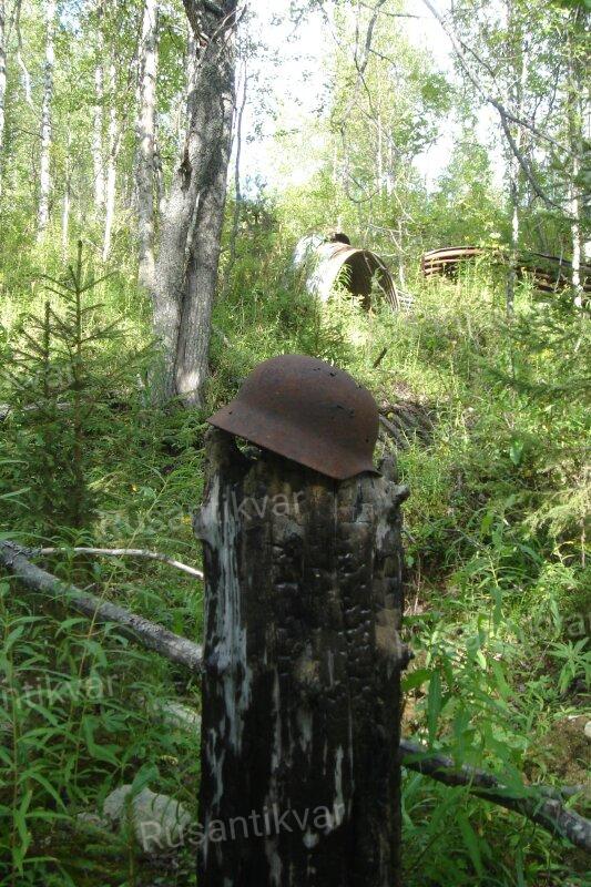 Дальше жизнь шла по графику - день на нашем берегу, день на том. В зависимости от уровня усталости и высоты волны. В один из дней мне перепал чужой прибор, хозяин решил передохнуть и порыбачить, а к вечеру соорудить баньку. Я же решил по завершении всех хозяйственных дел в лагере дойти до позиций по 1941 году. Была на хозяйстве распечатка с мелковатой, но понятной схемой. Наши пограничники и остатки отошедших с новой границы частей держали высоту километрах в трёх от лагеря, но их выбили. Дальнейшие попытки закрепиться оказались неудачными, и окончательно наши остановились километрах в десяти, в самом конце озера. Как раз там мы в предыдущий заезд очутились в поисках дороги. Меня тогда потрясла там она высота – сосновый лес, земля почти лысая, редко-редко тонкий мох. И всё засыпано ровным ковром гильз. Выглядело это так, будто война не больше 10 лет как закончилась. Но я решил прогуляться на запад, откуда наших выбили. Спутница жизни присоединилась к прогулке с целью набрать грибов. Километра три мы собирали грибы, коих на дороге росло в изобилии. В основном подберёзовики и подосиновики, немного белых. Потом я решил, что гребень высоты вроде как уже прошли и ломанулся в лес. А там пусто. Шёл-шёл, вышел на красивые позиции. Красивые с копарьской точки зрения – это то, как в нашей полосе они выглядели лет 40 назад – стоят себе брёвна стенок, связанные проволокой, по траншеям бегать можно. Да и по прямому назначению тоже использовать. Решил, что это как раз наши позиции и давай по ним прибором махать. Что-то пустовато… Ага, блиндажик с осевшим накатом. Сунул прибор в угол – что-то есть. А сверху всё это закрывает ковёр мха. Поднял я его и по-доброму ошалел. Очень жалею, что не сфотографировал, а сразу шаловливыми ручками потянулся. Стена блиндажа из брёвен, в стену вбит большой гвоздь, на гвозде, как ни в чём не бывало, висит складная лопатка в кожаном чехле. Чехол и деревянная ручка по закону подлости развалились в руках, но лопатка оказалась очень хорошей. Сам факт! Висит, зараза, на гвозде! 2010 год на дворе, а она висит! Странно, а что немецкая сапёрка делает в нашем блиндаже? Трофей? Пошёл дальше по траншее – ни настрела, ни барахла, ни даже вездесущих консервов, только кольца толстой проволоки, связывающей брёвна. Метров через сто я окончательно убедился, что даже эту пустую траншею и поэтому совсем никем не копанную надо звонить всю. Под очередным моховом ковром между деревянными стенками траншеи лежала себе, как вчера положили, неплохая немецкая каска с остатками зимней перекраски. Даже стальной подшлемник неплохо сохранился, что обычно с ними не случается.