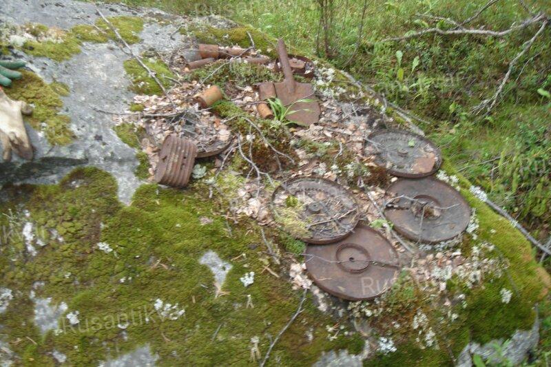Тут же вся куча гильзача была перекопана в поисках достойных экспонатов. Большинство было при жизни засунуто в картонные футляры, через что сильно погнило. Гильзы стальные и обмеднённые. Штабель укупорок также был перетряхнут. Самые верхние и самые нижние ряды были основательно подгнившие, а вот в серединке каждый нашёл достойных переносок с маркировками, с целым нетронутым деревом и прочими плюшками. Поиск с приборами расстроил – вообще ничего. Не считая пятёрки стреляных финских винтовочных гильз, какого-то лома и хитрого спирального кола для растяжки. Если батарея выстрелила с этого острова около тысячи снарядов, то где следы бытования расчётов, чёртовы консервы хотя бы? Где осколки от нашей контрбатарейной стрельбы? Но, увы – понакопано много, да всё пусто. Народ плюнул, навьючился и пошёл назад в лагерь рыбачить. Мы же вынесли трофеи на дорогу и стали нарезать зигзаги вокруг старой дороги, чтобы хоть что-то нарыть. У дороги, как единственной транспортной артерии когда-то царило оживление. Как водится всё в консервах и разномастных следах передвижения советских, немецких и финских войск. В итоге, ничего выдающегося не нашли. Только умучились зазря и, навьючившись переносками и гильзами, потащились в лагерь.