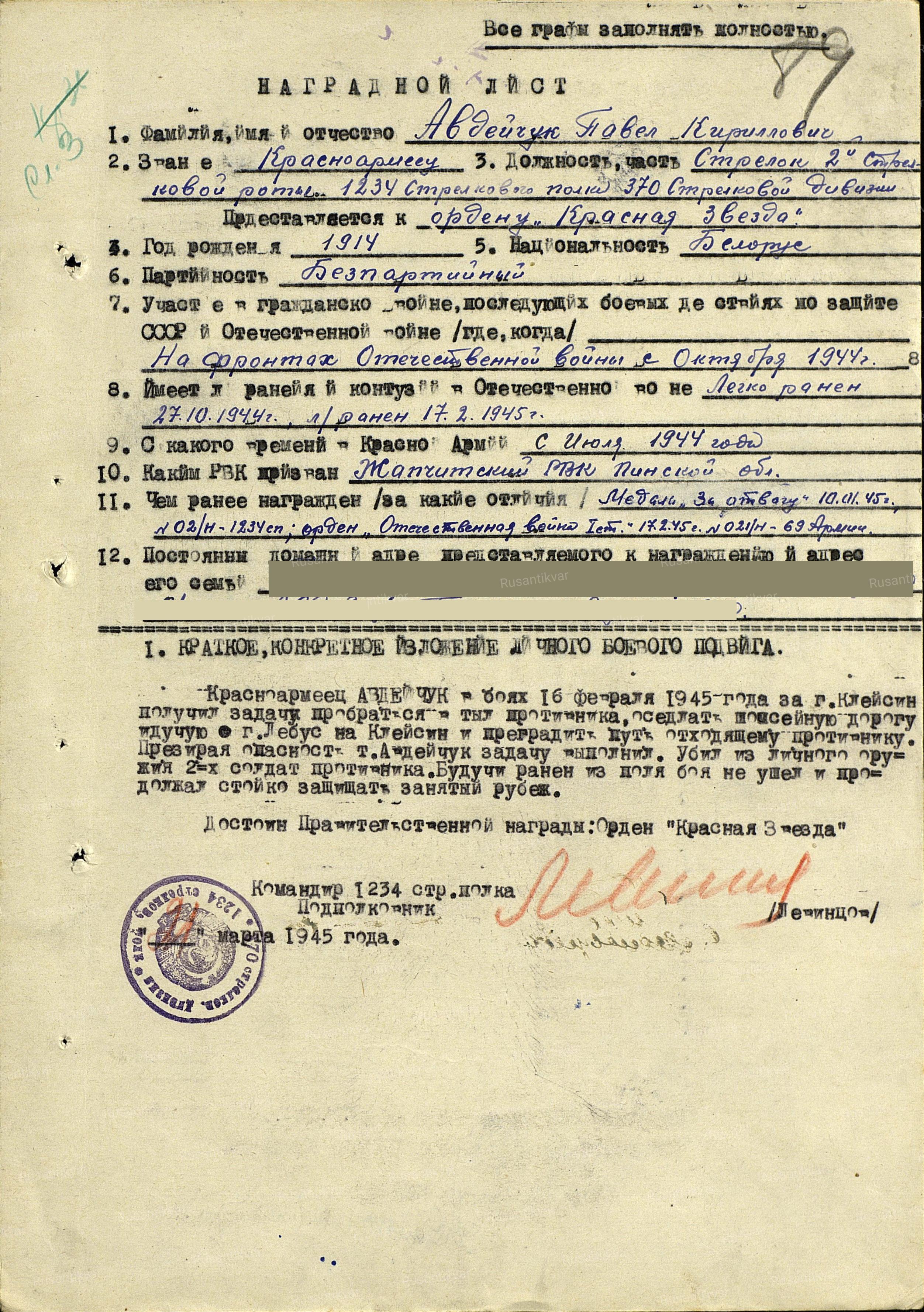 Получается, что 12 февраля 1945 года красноармеец Авдейчук получил медаль «За Отвагу», а уже 16 февраля 1945 года в бою за Клессин он был ранен и представлен к ордену «Красная Звезда». Ни одно слово в наградном листе не указывало на гибель Авдейчука...