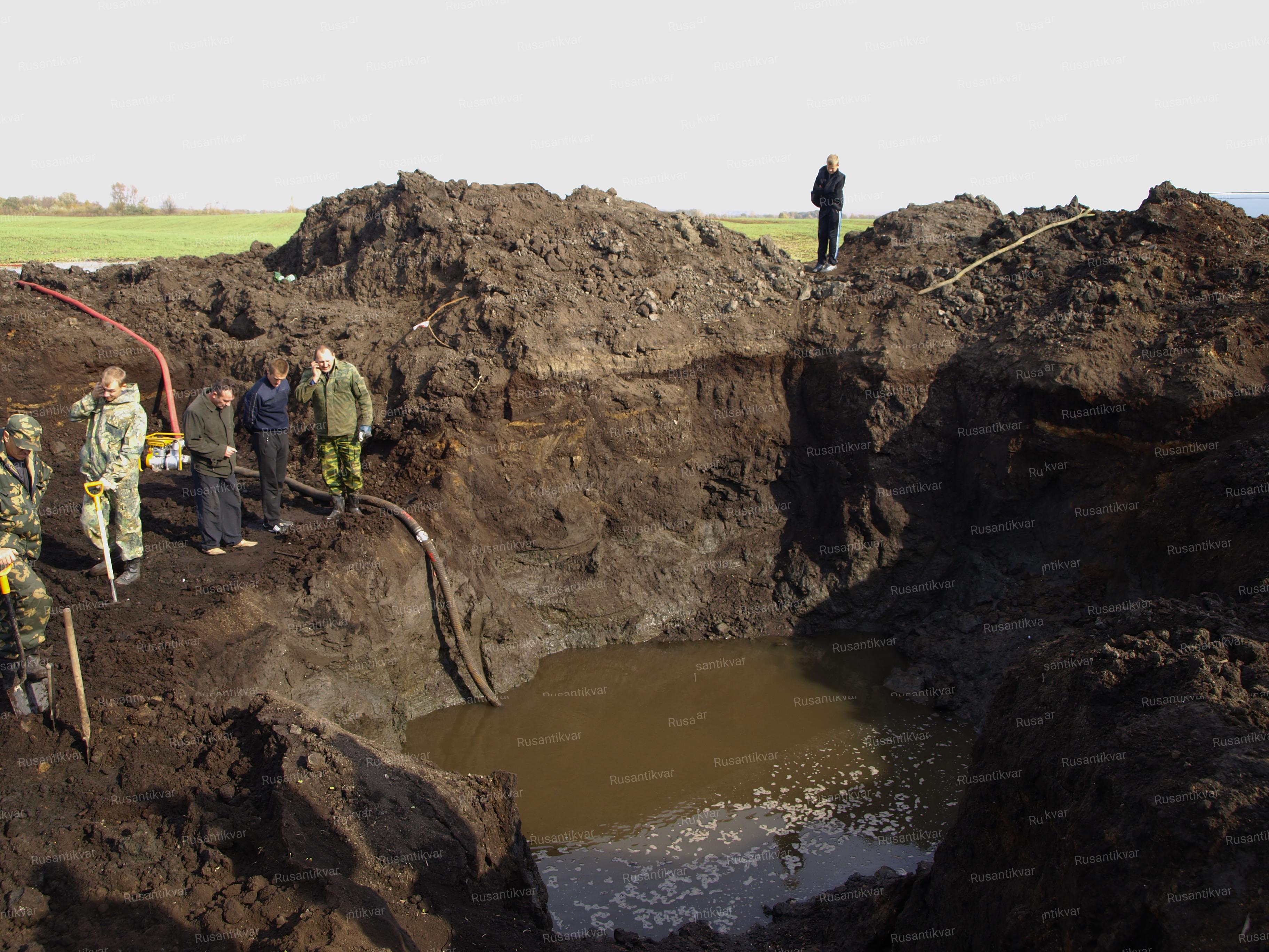 26 сентября работы были продолжены с помощью экскаватора. Вылет стрелы с ковшом в шесть с половиной метров обеспечивал надежное обнаружение обломков самолета. Шурфы пробивались на местах наибольшего скопления металла. Тщательно просматривались отвалы земли. Был задействован в работе, помимо металлодетекторов, сканер грунта (глубина обнаружения до шести метров). Но три дня работы к результату не привели. Из девяти вырытых ям, небольшие фрагменты самолета были обнаружены на глубине свыше трех метров только в двух ямах. 28-го сентября в десятой по счету яме на глубине трех – трех с половиной метров стали встречаться обломки самолета, лежащие в грунте достаточно плотно. А на глубине свыше пяти с половиной метров ковш экскаватора наткнулся на двигатель самолета с редуктором и воздушным винтом.