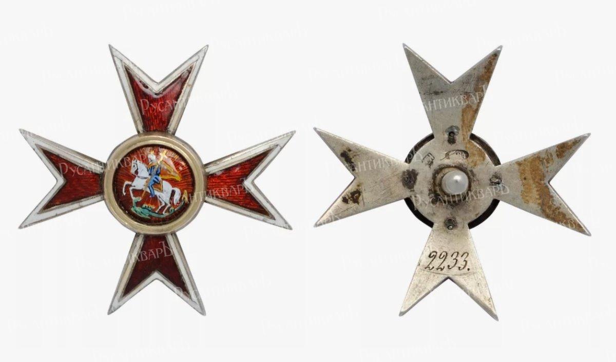Нагрудный знак Высочайше утверждён 4 октября 1913 года. Мальтийский крест красной эмали с белым ободком. В середине его красный эмалевый кружок с золотым ободком, а на нём белая фигура Святого Георгия Победоносца.
