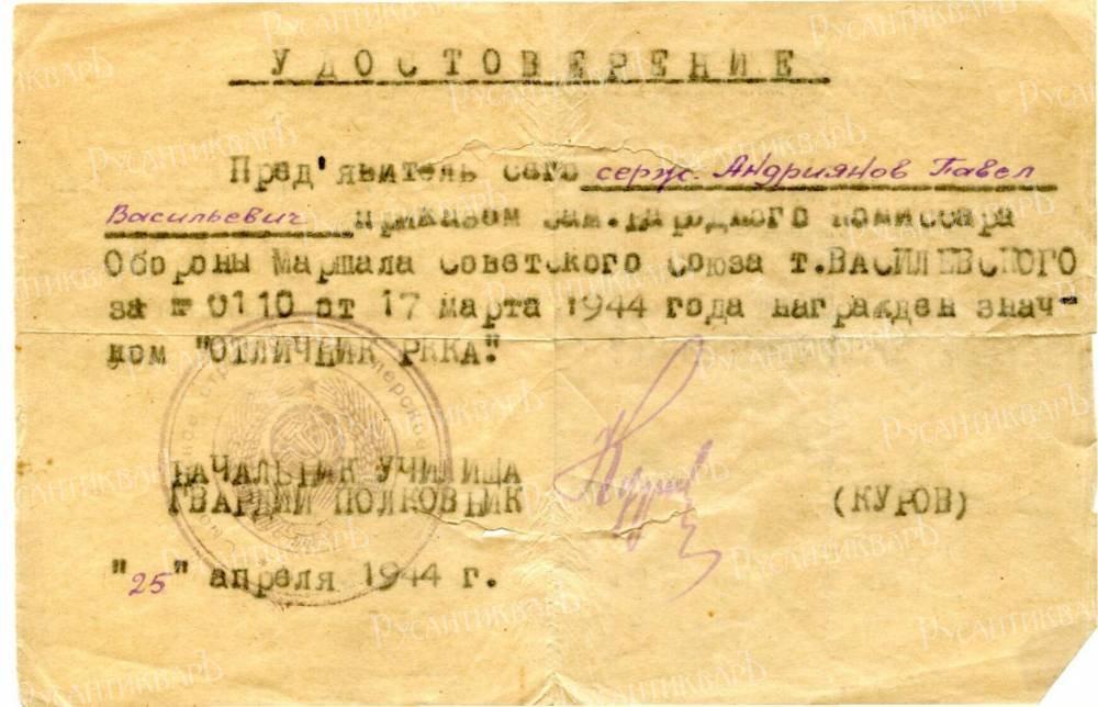 Удостоверние к знаку "Отличник РККА".