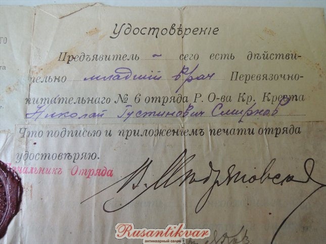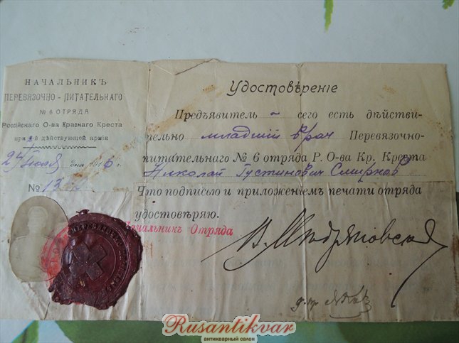 Удостоверение младшего врача общ. Красного креста. Из моей коллекции.