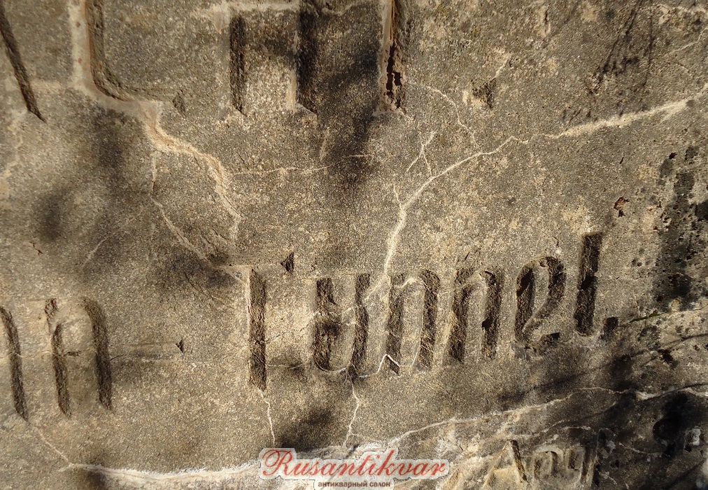 И вот на прошлой неделе мы с коллегой Дмитрием («швагра») наконец решили проверить эту информацию. Конечно, сам тоннель не сохранился, но просматриваются места, где вероятно были вход и выход. В одном месте мы нашли , скорее всего, остатки полузасыпанной грунтом входной арки, на которой сохранились вот такие чёткие надписи. Год постройки этого тоннеля -1916.