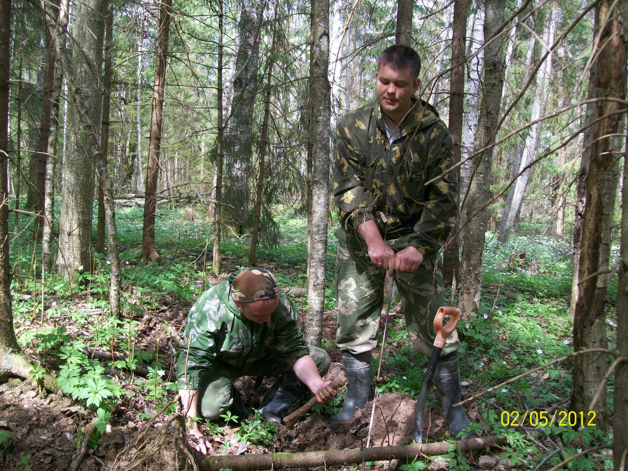 Есть в отряде «Группа Поиск» 2 бегунка: Вова и Леха. Ростом компактные, в лесу юркие. Владимир Муленко и Алексей Трубинов по прозвищу «Сирота». То ли фамилию его в первую экспедицию никто не мог запомнить, то ли он ее и не говорил, но «Сиротой» Леха стал с самой первой вахты. В общем, начитались они архивов, собрали рюкзаки и ломанулись на разведку к урочищу Сорокино в Новгородской области. Вернулись под вечер довольные. Нашли интересное место.