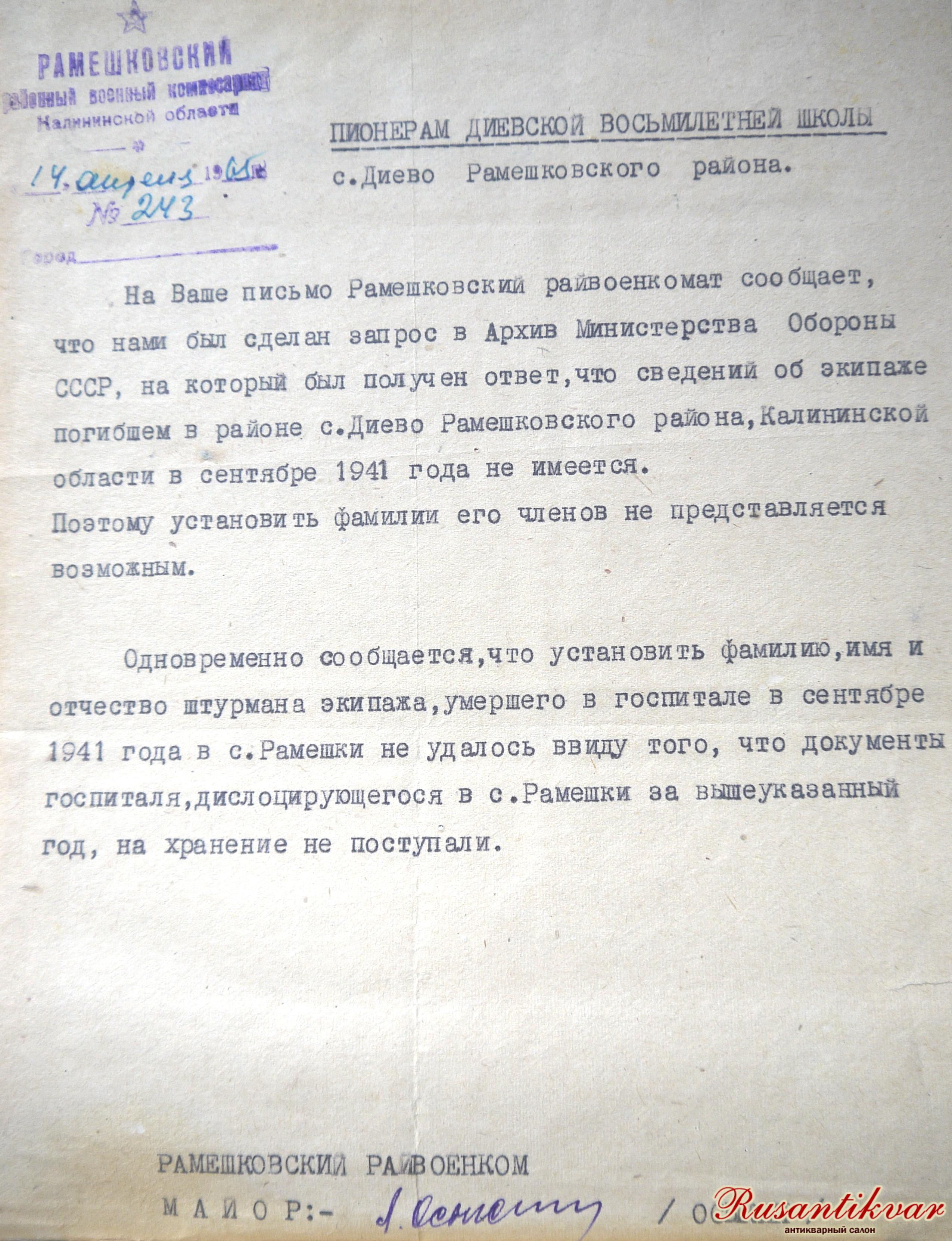 12 марта 1968 года из 4-го отдела Министерства обороны СССР пришло сообщение: «На письмо учеников вашей школы сообщаем, что в приказе по 1 дальне-разведывательному полку за № 27 от 01.10.1941 значится: «При выполнении боевого задания 15.09.41 года погибли: