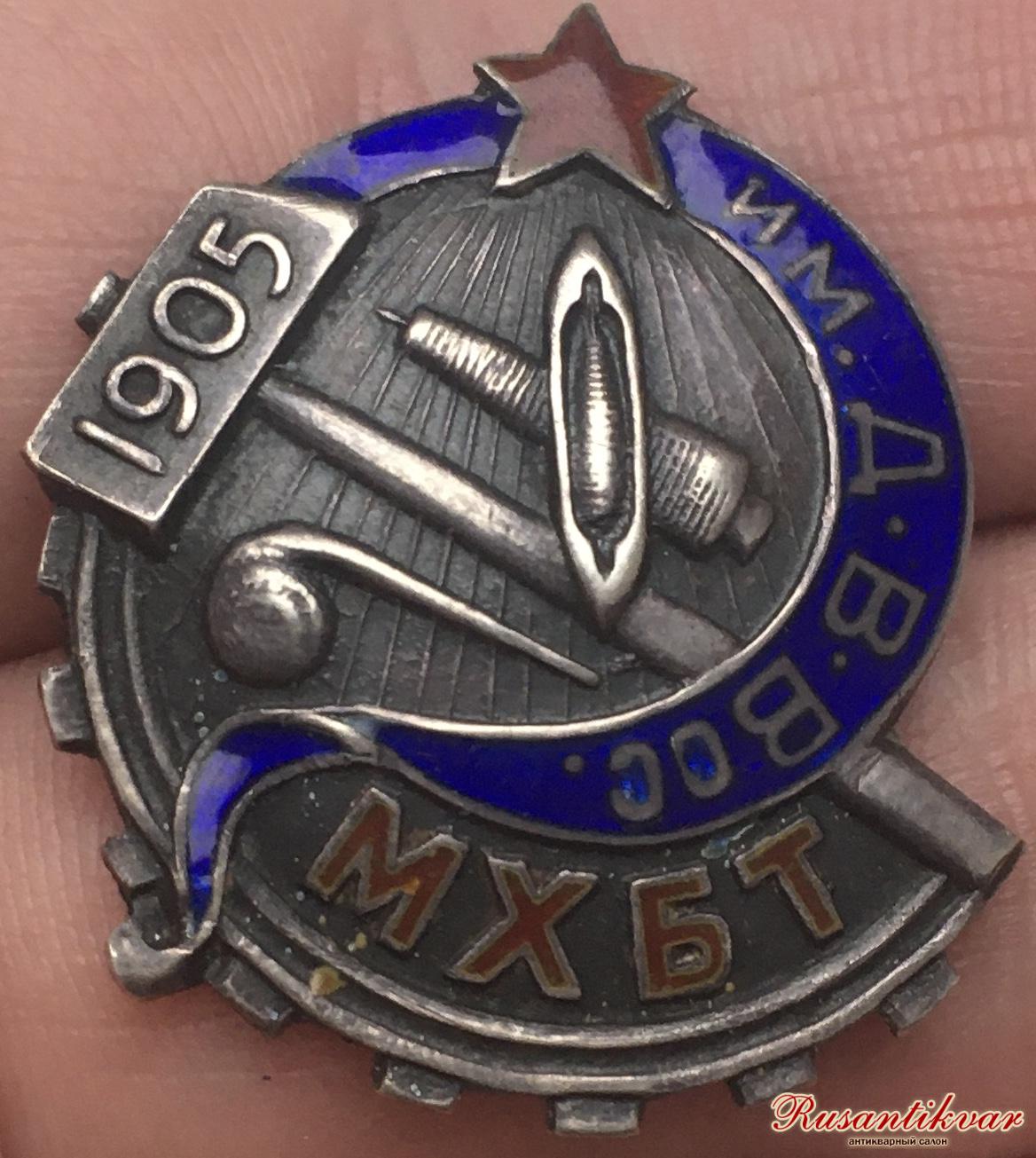 Знак МосковскогоХлопчатобумажногоТехникума им. ДекабрьскогоВосстания 1905г. Редкий, выполнен в серебре, в отличном состоянии, укомплектован оригинальной гайкой, резьбу держит хорошо.