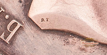 Инициалы медальера на обрезе. На реверсе буква "I" без точки. Надпись начинается слева снизу.