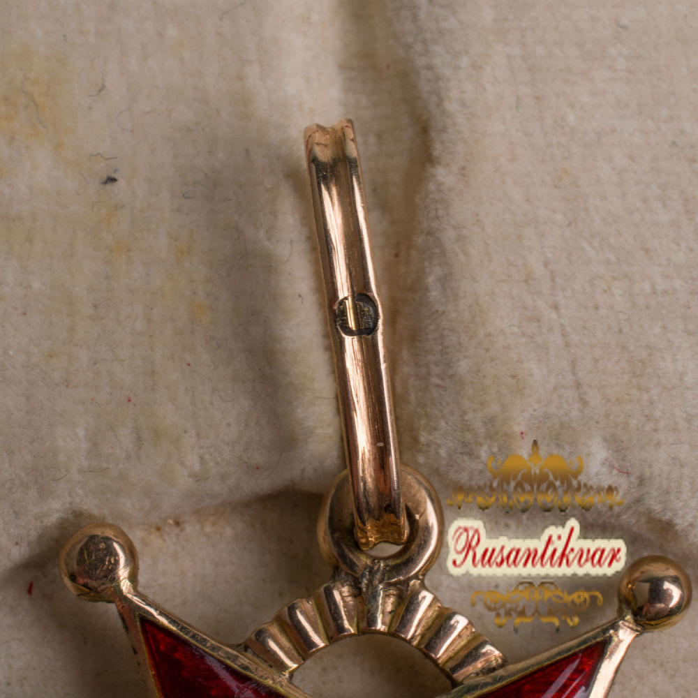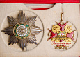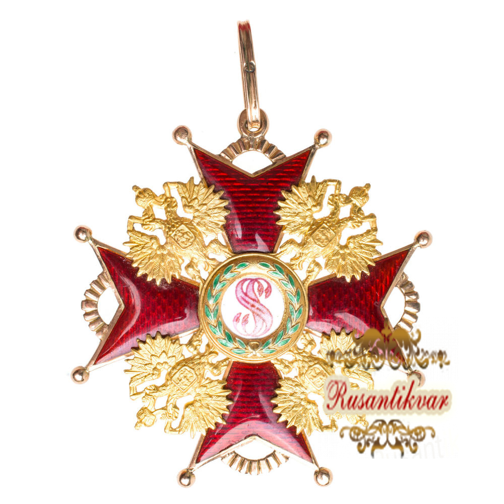 1. Знак ордена Св. Станислава 1 - й степени на орденской ленте. СПб, 1897 - 1908 гг. Фирма "Эдуард". Клейма: на оборотной стороне знака ордена, на ушке - СПб окружного пробирного управления в овальном щитке (альфа, женская головка в кокошнике, вправо, "56"); на концах креста, вверху - именное клеймо "ИЛ", внизу - клеймо фирмы "ЭДУАРДЪ"; на дужках горизонтальных концов, на шариках вверху справа и внизу слева и на соединительном звене - клеймо этого же пробирного управления в круглом щитке (женская головка в кокошнике, вправо, точка под подбородком). Золото, эмаль, шёлк (муар), 31.53 гр. Размеры 66.5 x 63.6 мм. Сохранность отличная (UNC).
