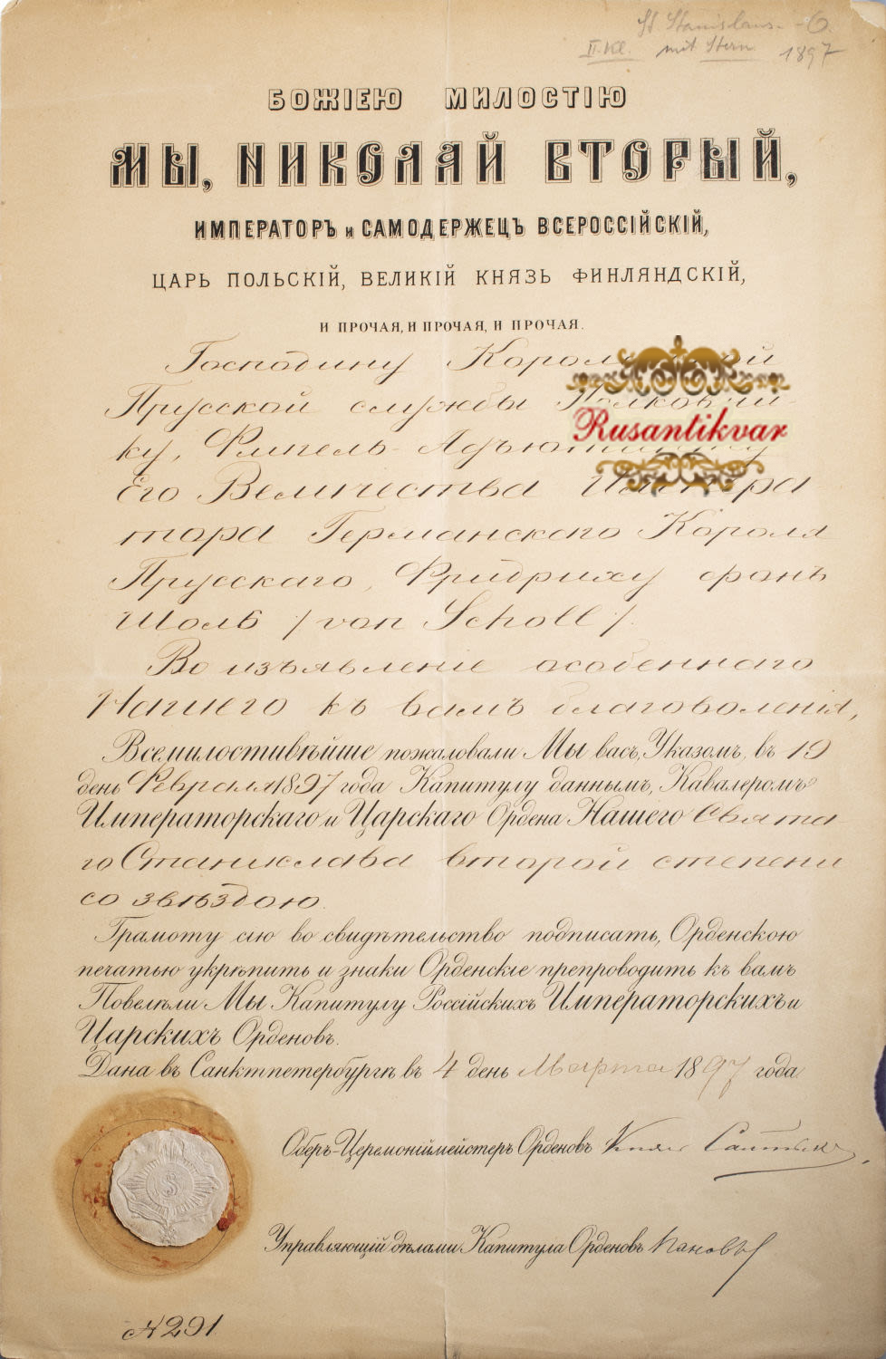 4. Грамота о пожаловании Прусского подданного, Господина Королевской Прусской службы Полковника, Флигель - Адьютанта Его Величества Императора Германского, Короля Прусского, Фридриха фон Штоля 4 марта 1897 г в кавалеры ордена Св. Станислава 1-й степени. Оригинал. Размеры 35.3 х 21.8 см. Сохранность очень хорошая (XF+).