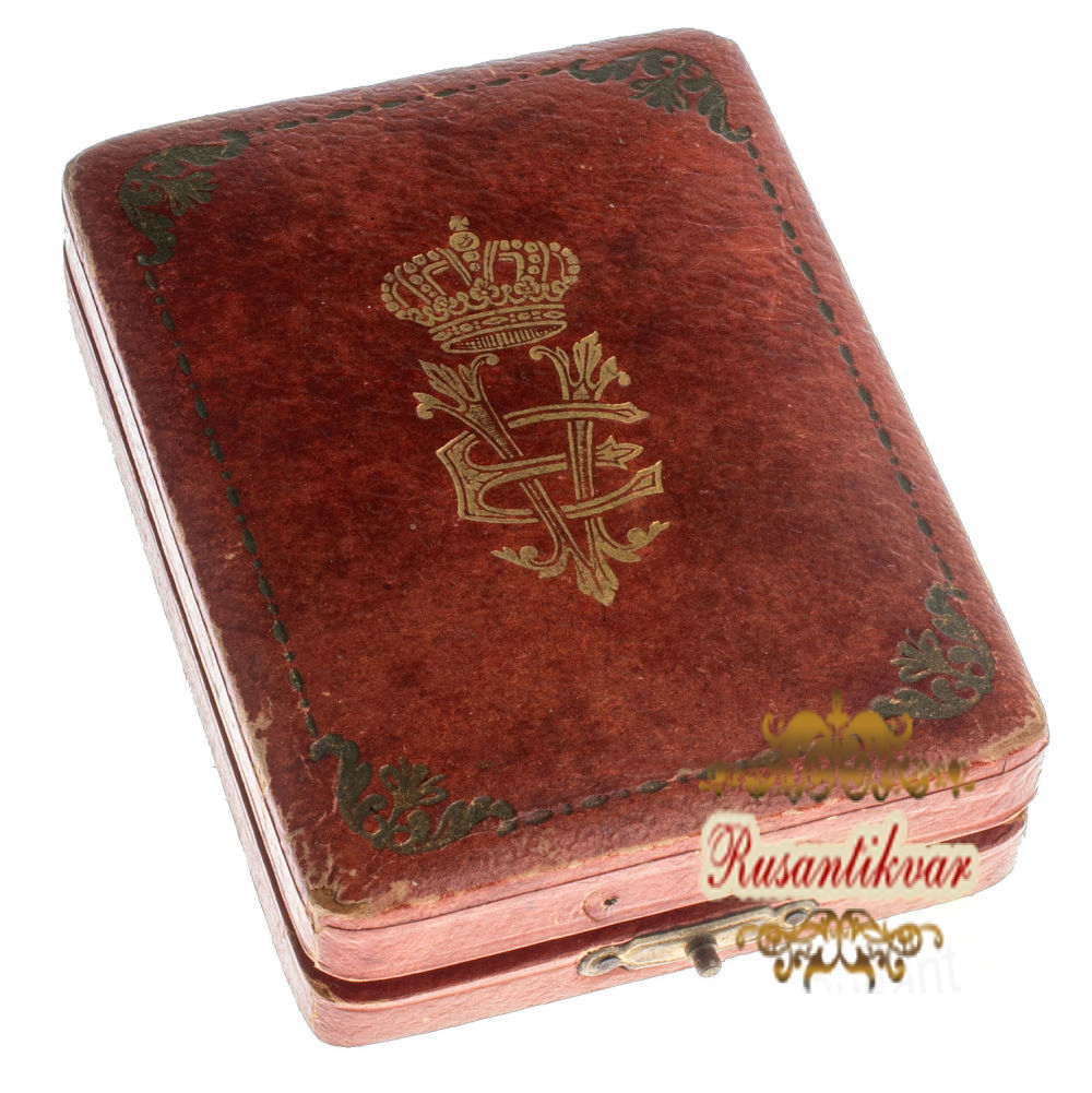 На внешней части крышки наградного футляра золотое тиснение короны и инициалов "VE" - Короля Италии Виктора Эммануила III (правление 1900 - 1943 гг). На внутренней части футляра маркировка производителя на итальянском языке "L. SUSCIPL ROMA"