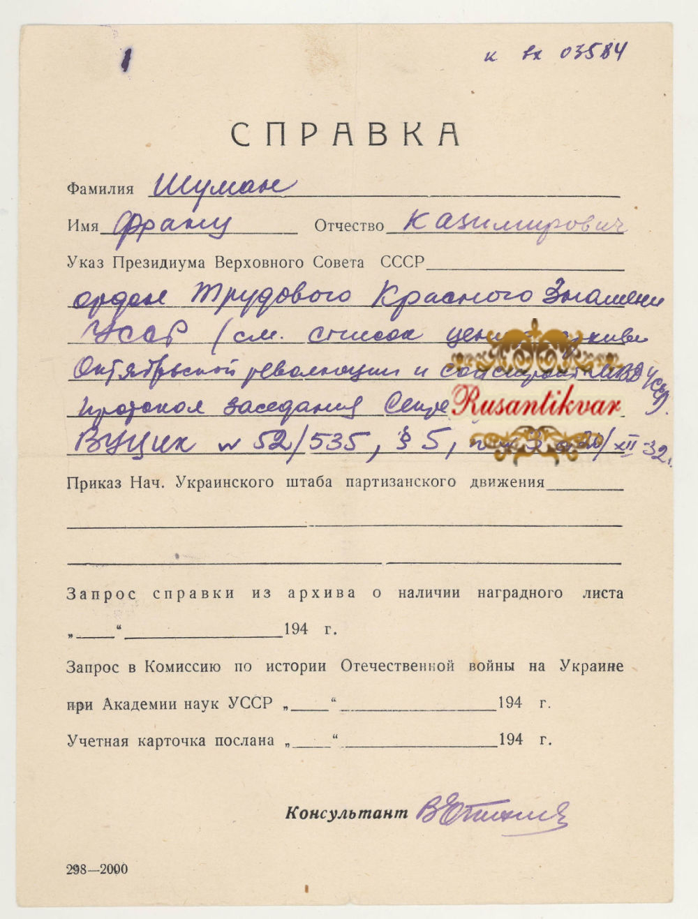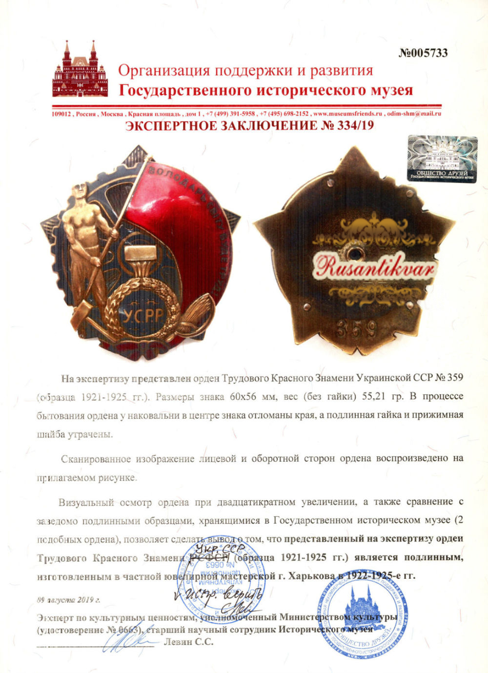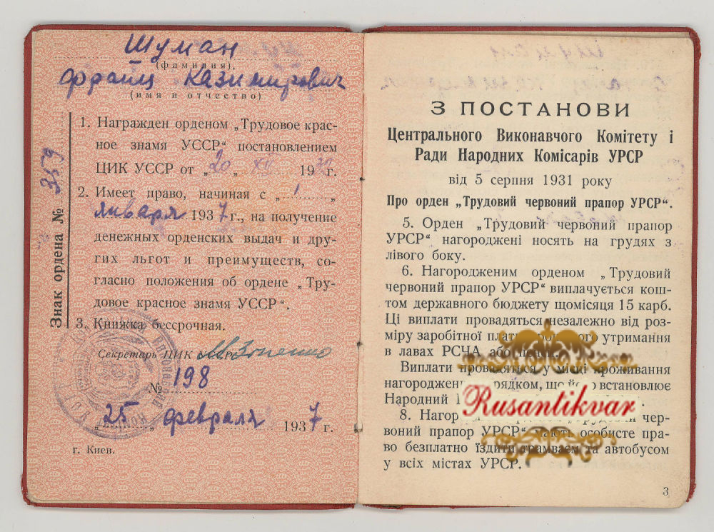 Украина (Украинская Советская Социалистическая Республика 1917 - 1922 гг). Орден Трудового Красного Знамени Украинской ССР № 359 с документами.