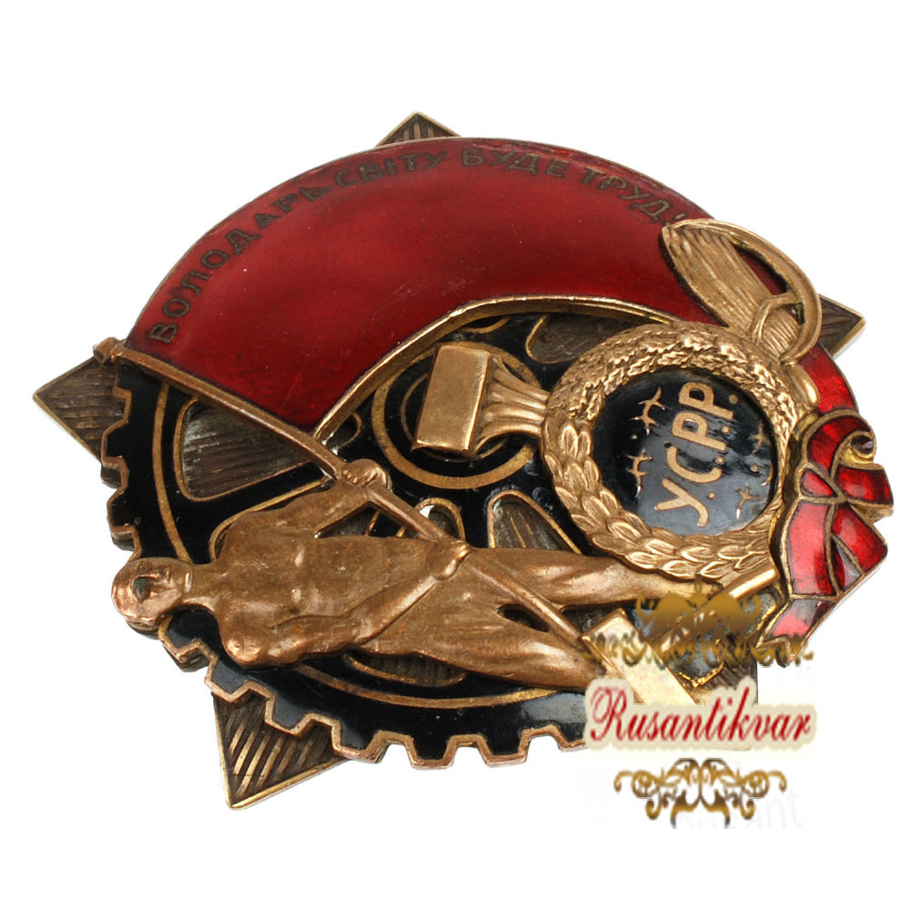 Учреждён 2 марта 1921 г. Харьков, неизвестная ювелирная мастерская, 1922 - 1925 гг. Латунь, золочение, гр. Размеры 60.15 х 56.9 мм. Сохранность отличная (UNC-), отломаны края с двух сторон у наковальни. Редкий (Р1). Награждено менее 400 человек. ПЛатунь, золочение, гр. Размеры 60.15 х 56.9 мм. Сохранность отличная (UNC-), отломаны края с двух сторон у наковальни. Редкий (Р1). Награждено менее 400 человек. Последнее нагр
